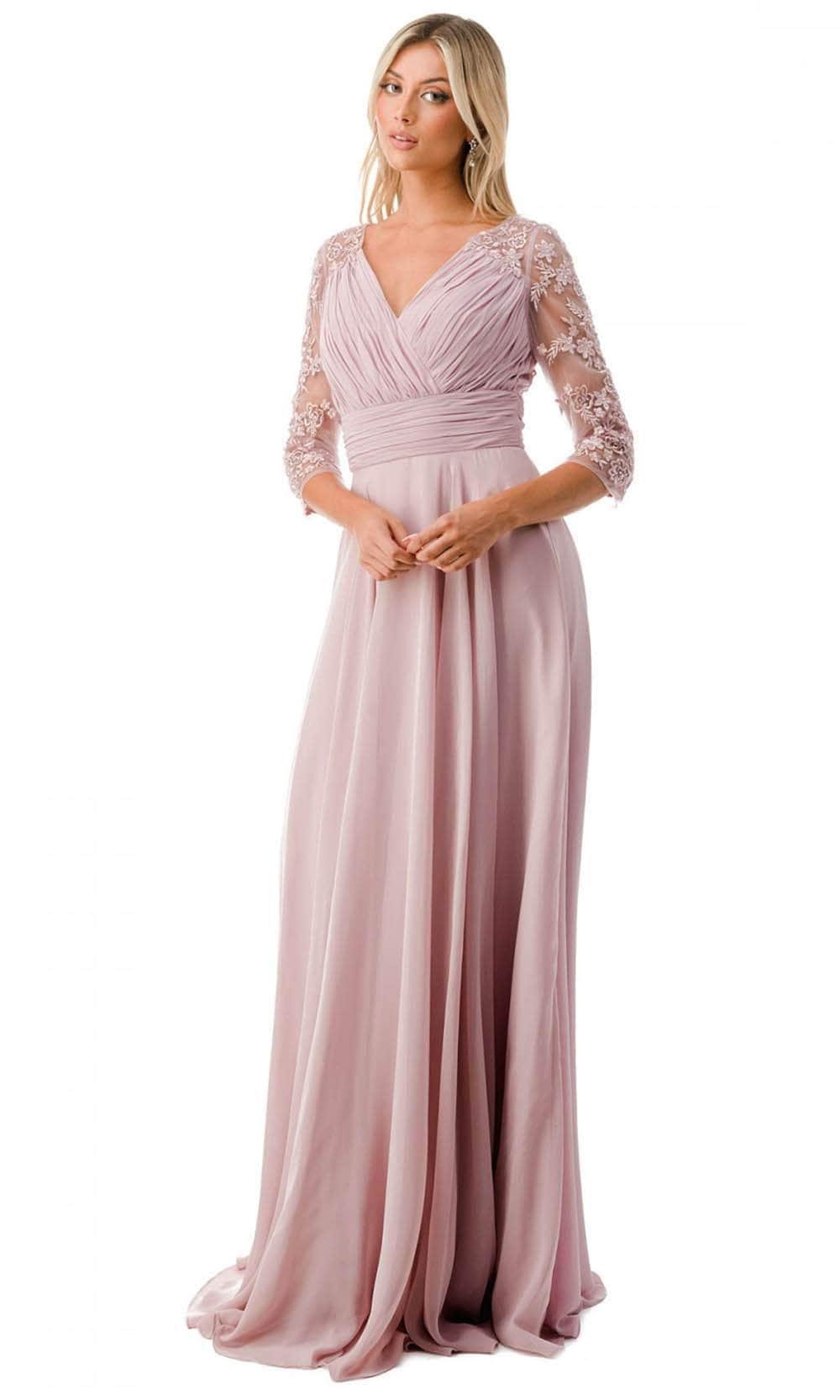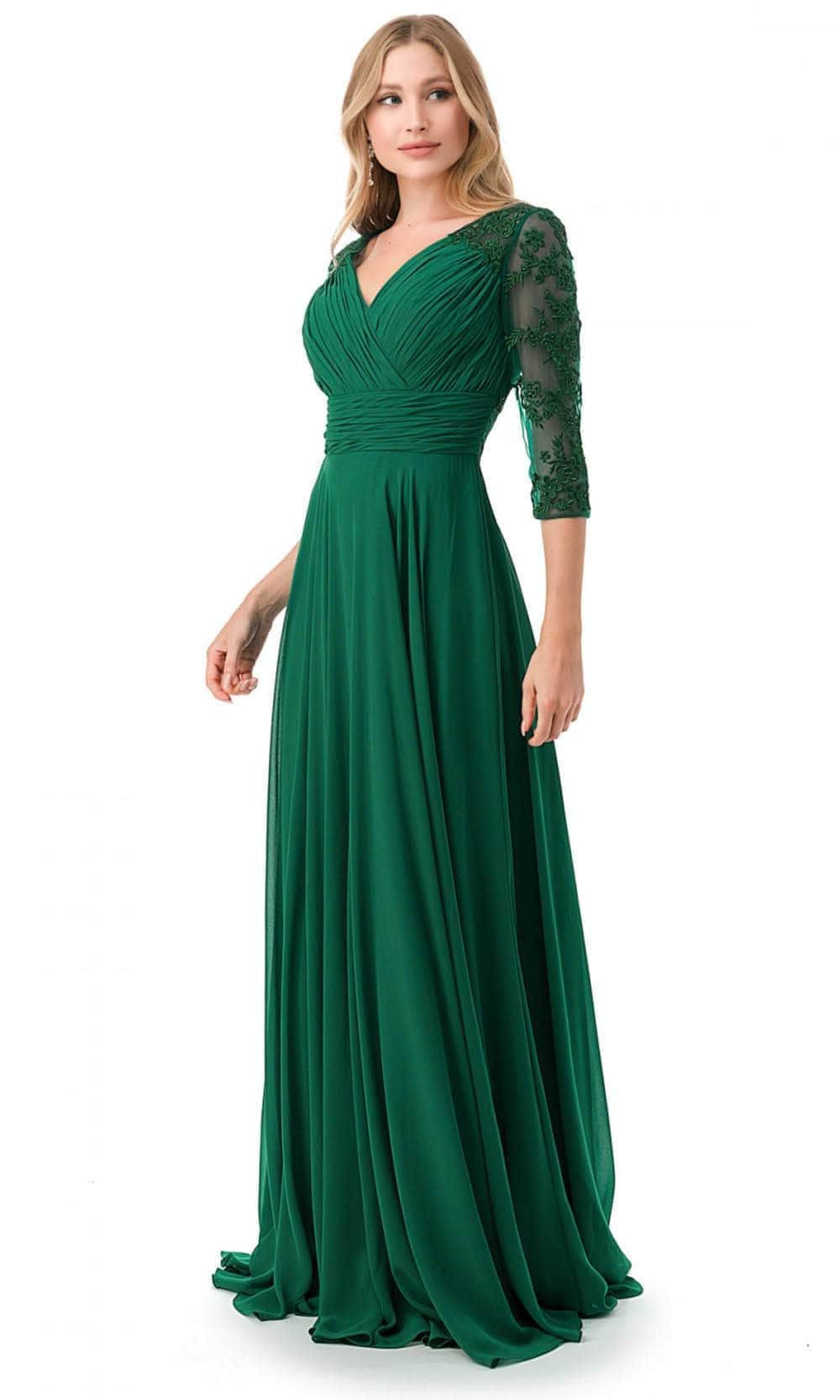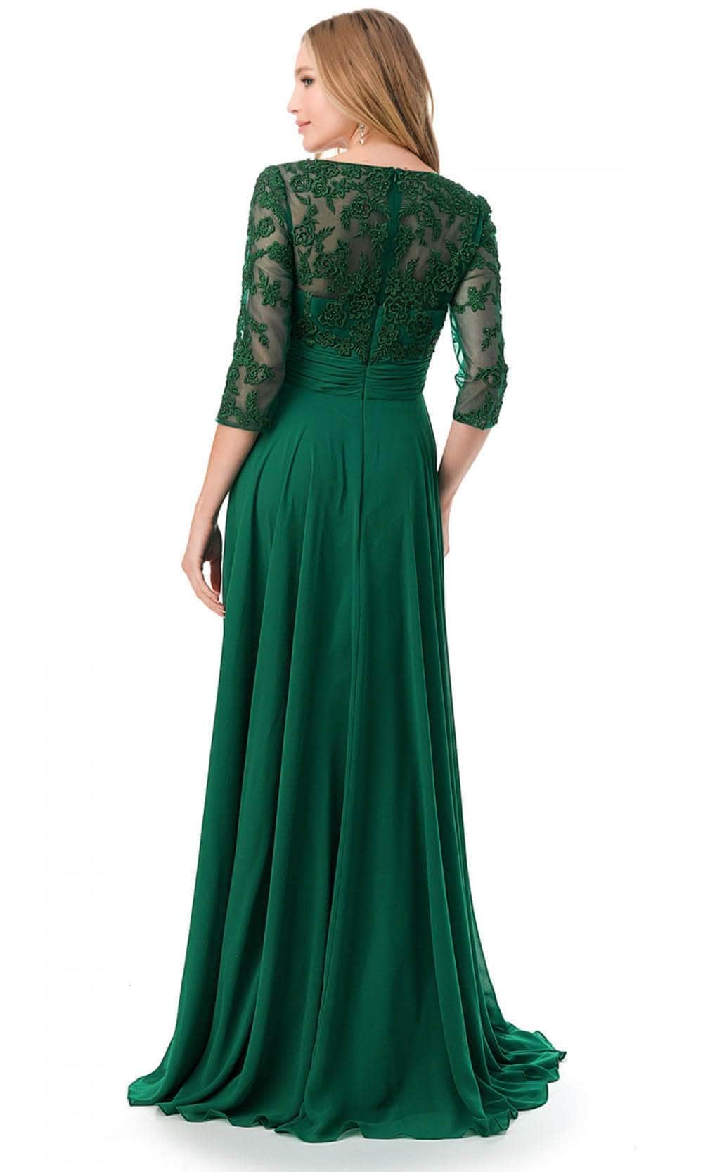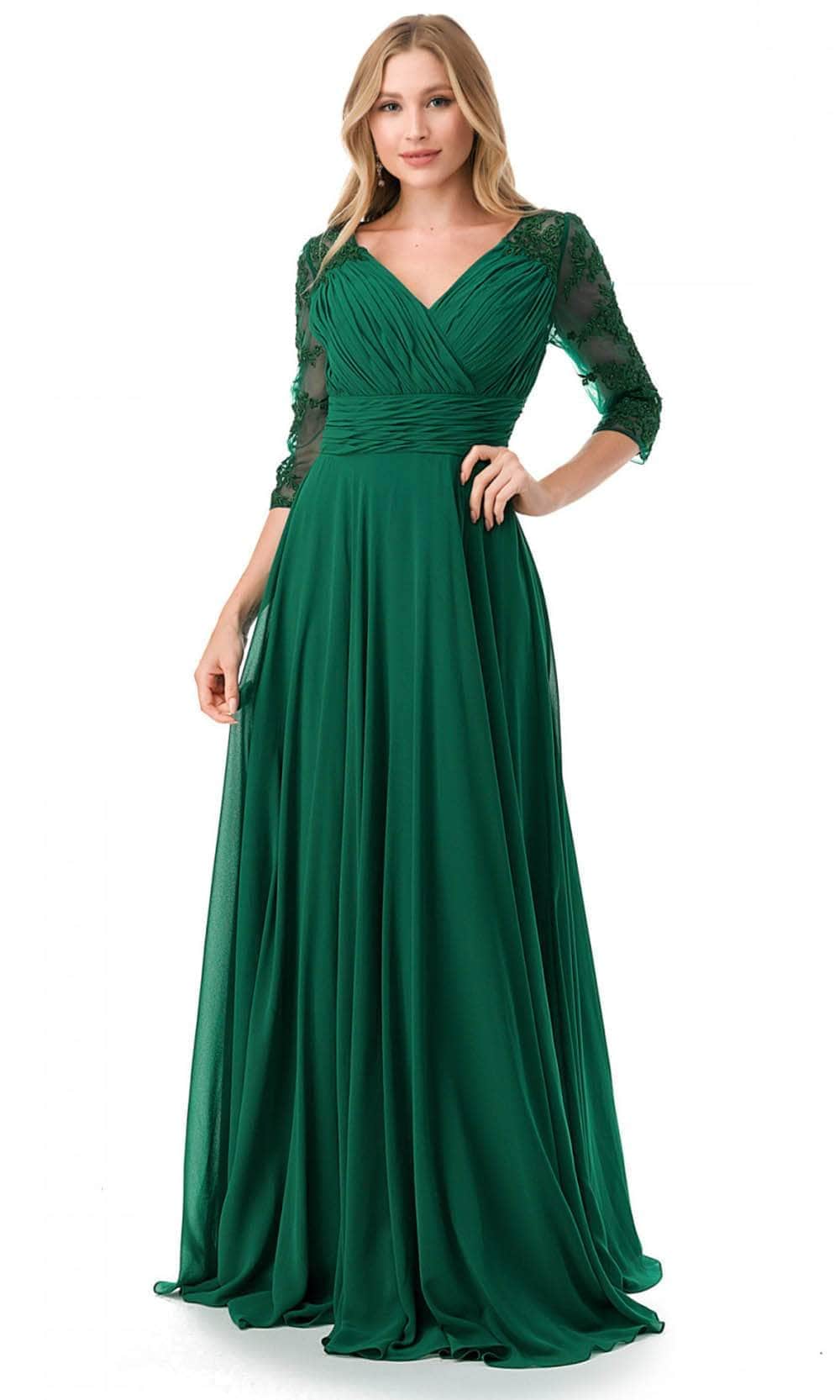 Dazzle the world in Trevi Collection M2733F, a masterpiece of elegance and sophistication. The exquisite dress is a canvas of gorgeous embroideries, intricately adorned with shimmering beads that catch the light from every angle. The quarter sleeves and the back showcase the artistry of craftsmanship, leaving onlookers mesmerized. The ruched bodice cinches with a cummerbund, creating a flattering silhouette, while the V-neckline adds a touch of allure. The full-back with a back zipper closure ensures a seamless fit, and the A-line silhouette gracefully flows to the floor, accented with a sweep train finish, leaving behind an air of enchantment with every step. This Trevi Collection M2733F is the epitome of timeless beauty and charm, a perfect choice for making a lasting impression on any special occasion. Models are wearing Mauve and Emerald colors.