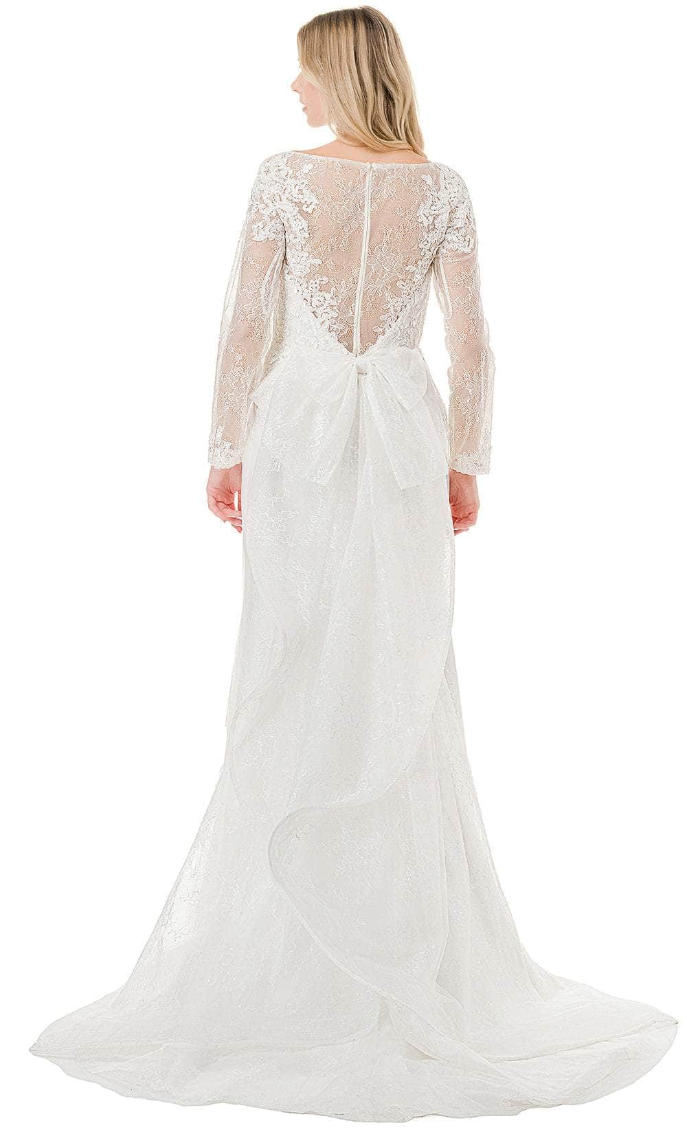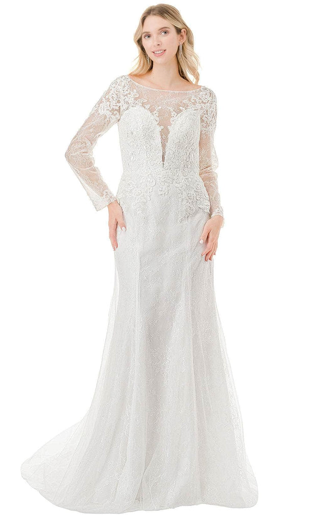Make a show-stopping statement as you walk down the aisle in this Trevi Collection MS0028 masterpiece. Crafted from lace with floral embroidery, this dress captures the essence of timeless elegance and beauty. The illusion bodice is crowned by long sleeves, a bateau neckline and an alluring plunging sweetheart lining. The illusion closed back features a mesmerizing v-shaped lining and a bow accent with a flowing tail that adds a whimsical touch. To top it off, the skirt unveils a sheath silhouette that descends to the sweep train for a romantic and mesmerizing movement. Feel dainty and feminine in this Trevi Collection MS0028 dress. Model is wearing Off White color.