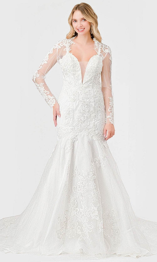 | Details: | Sheer Long Sleeves, Embroideries, Sheer Insert, Back Cut-Out, Back Zipper Closure, Train |
