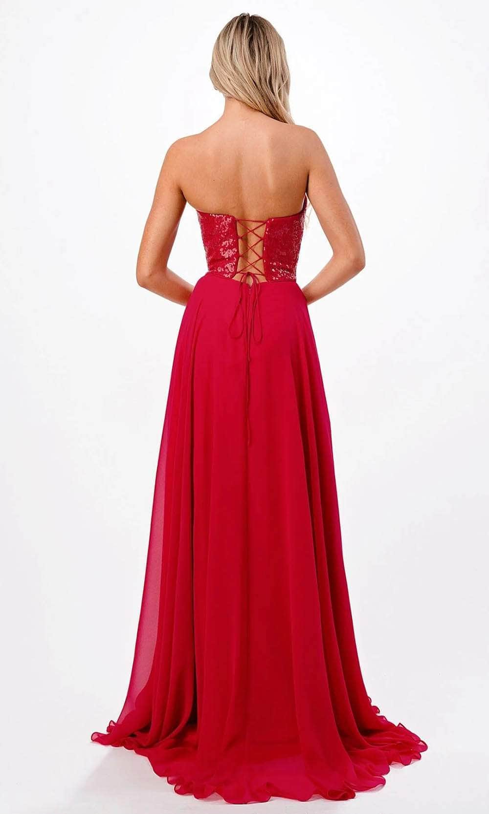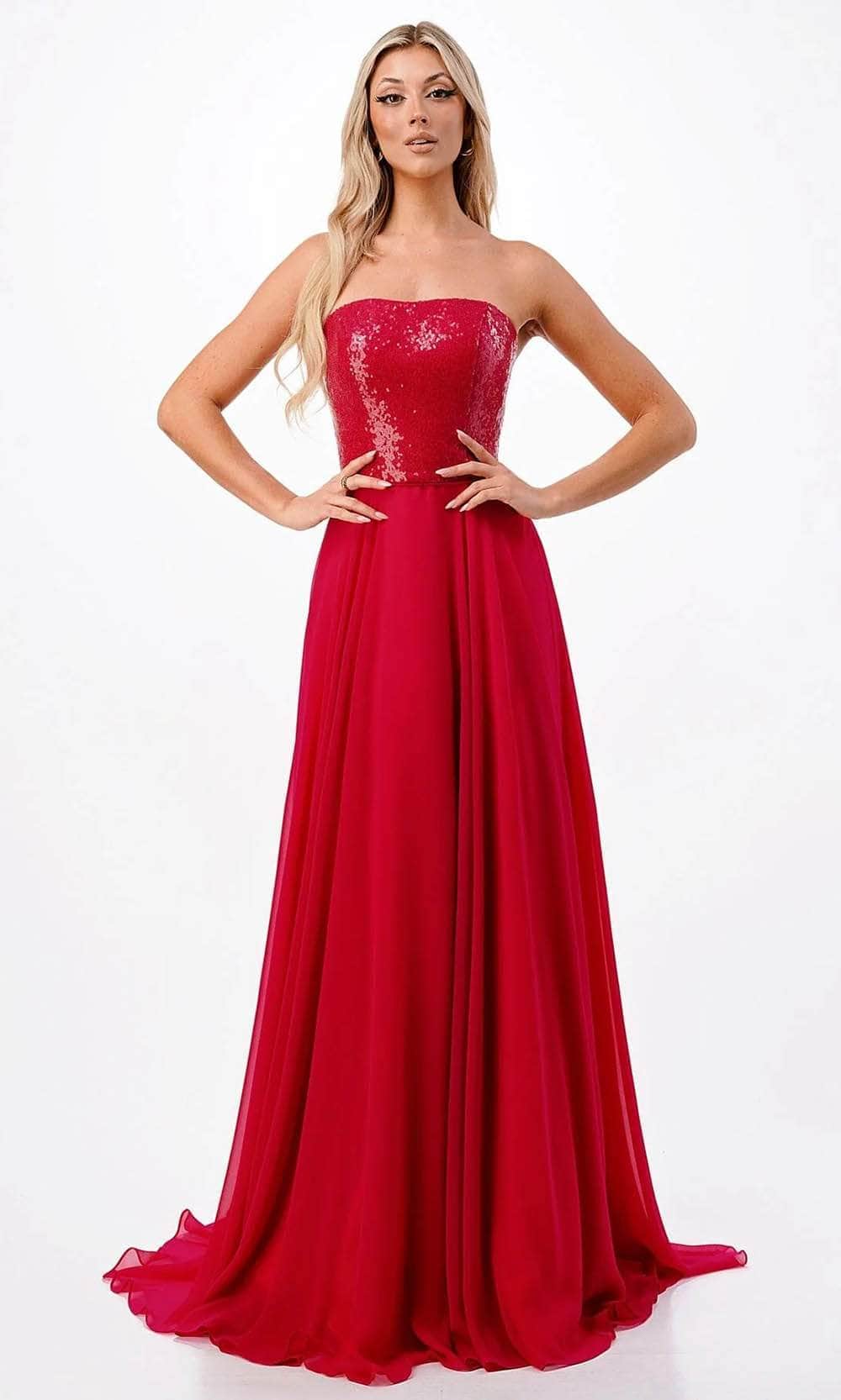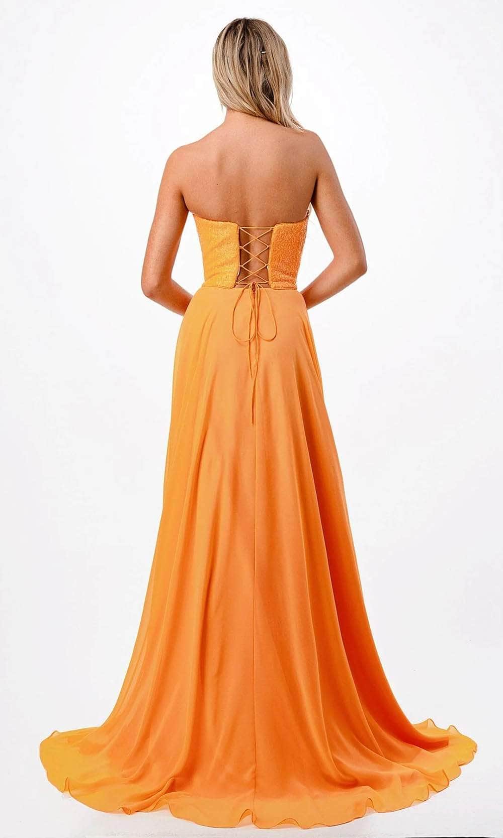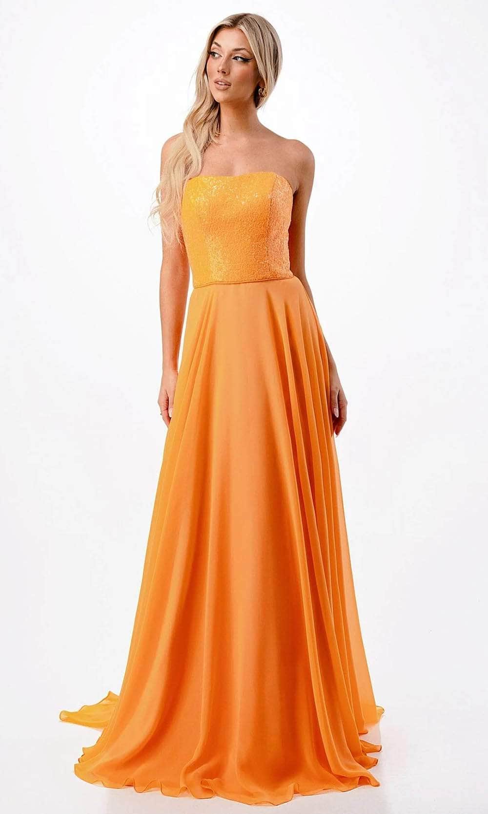 Leave everyone breathless with admiration as you saunter into the ballroom in this Trevi Collection P2206 creation. This strapless beauty showcases a timeless straight-across neckline that exudes sophistication. Designed with a sequin bodice that glimmers as it catches the light, this ensemble is crafted with a lace-up back that ensures a perfect fit for a stunning silhouette. The soft A-line skirt gracefully flows as it parades a sense of ethereal beauty. The ensemble also shows a sweep train as it flows to the floor. Step into the spotlight and mesmerize the crowd in the Trevi Collection P2206 masterpiece. Models are wearing the Mustard and Watermelon colors.