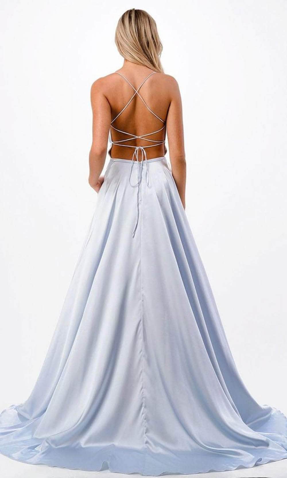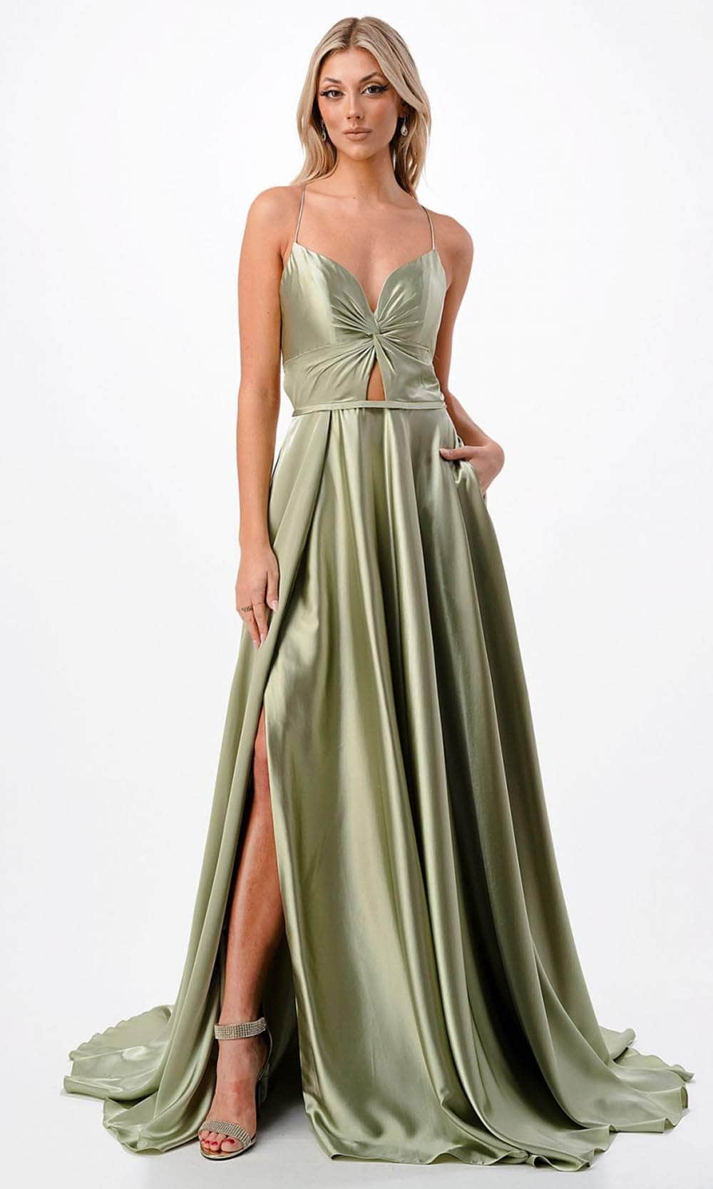You are bound to start a fashionable trend in this Trevi Collection P2216 masterpiece. Crafted from satin fabric, this beautiful sleeveless piece flaunts a ruched twist front with a sweetheart neckline, cutout at the center midriff and thin waistband. The daring backless design has strappy lace-up tie closure for a comfy and adjustable fit. With side pockets and a sexy thigh-high leg slit, the skirt flawlessly streams to the floor length hem and exits into a sweeping train. Exude a timeless appeal in this elegant Trevi Collection P2216 gown. Models are wearing the Blue-Silver, Gold, and Pistacho colors.