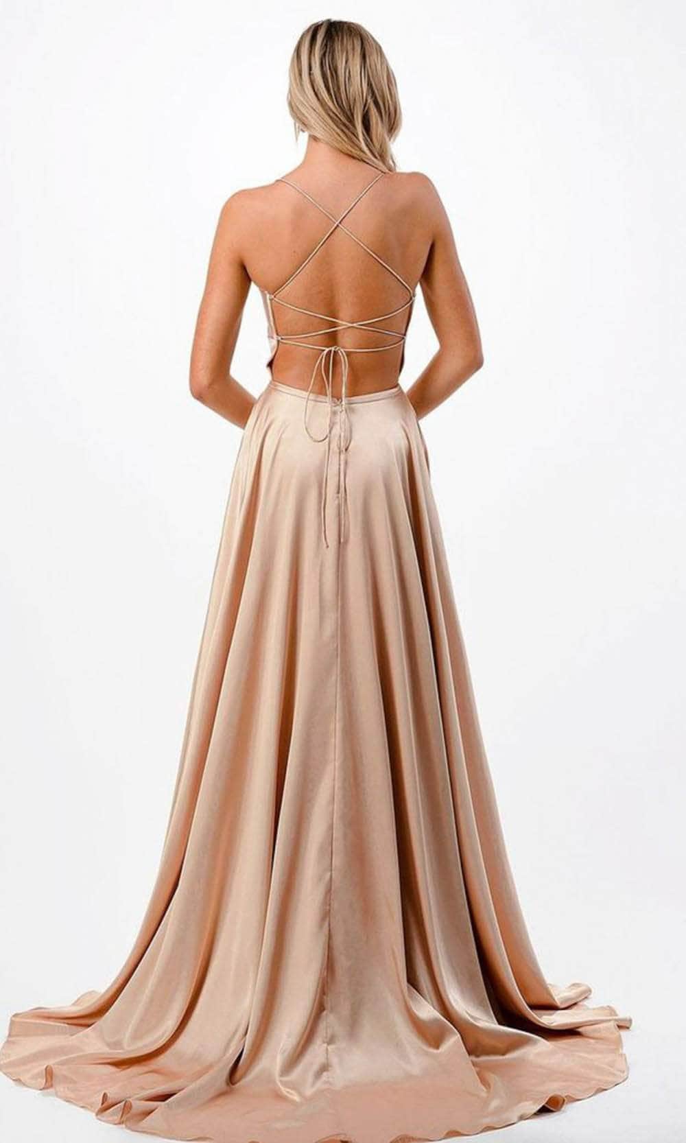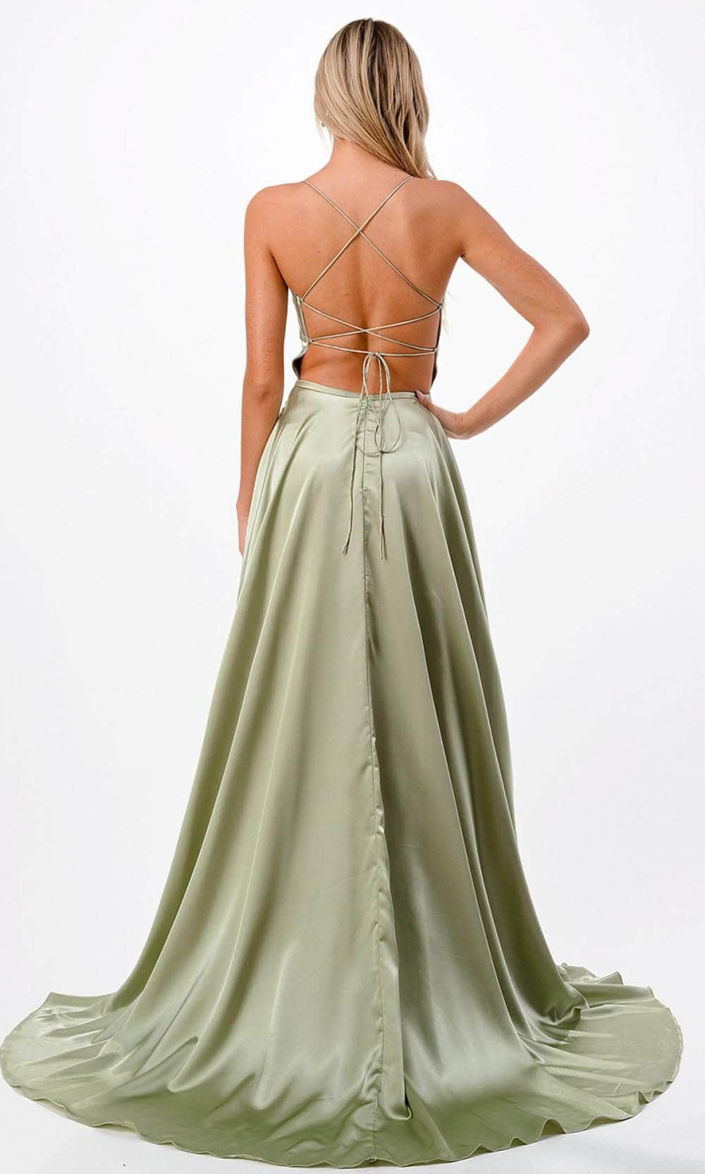| Details: | Spaghetti Strap, Twist Front, Ruched, Cutout, Open Lace-Up Back, Side Pockets, High Slit, Sweep Train |