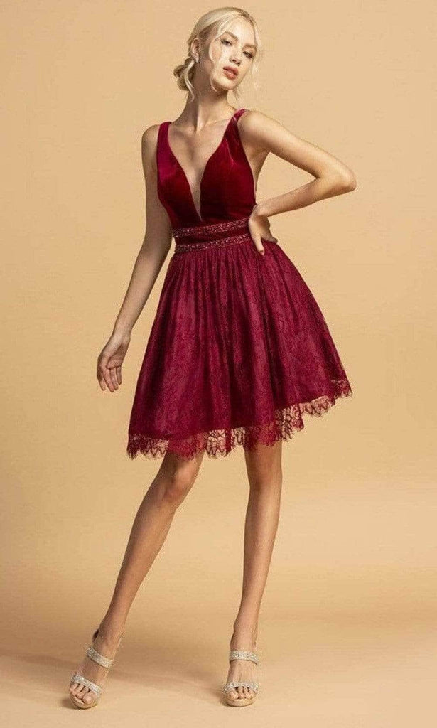 Steal the show while mesmerizing in this Trevi Collection S2082 creation. Tailored with a velvet bodice, this stunner creates a plunging v-neckline with a sheer inset. Nipped with beaded bands along the natural waist, this piece also has a v-open back. The lace draped A-line skirt flares into a short scalloped hemline. Showcase impeccable taste in this Trevi Collection masterpiece. Models are wearing the Burgundy and Navy colors.