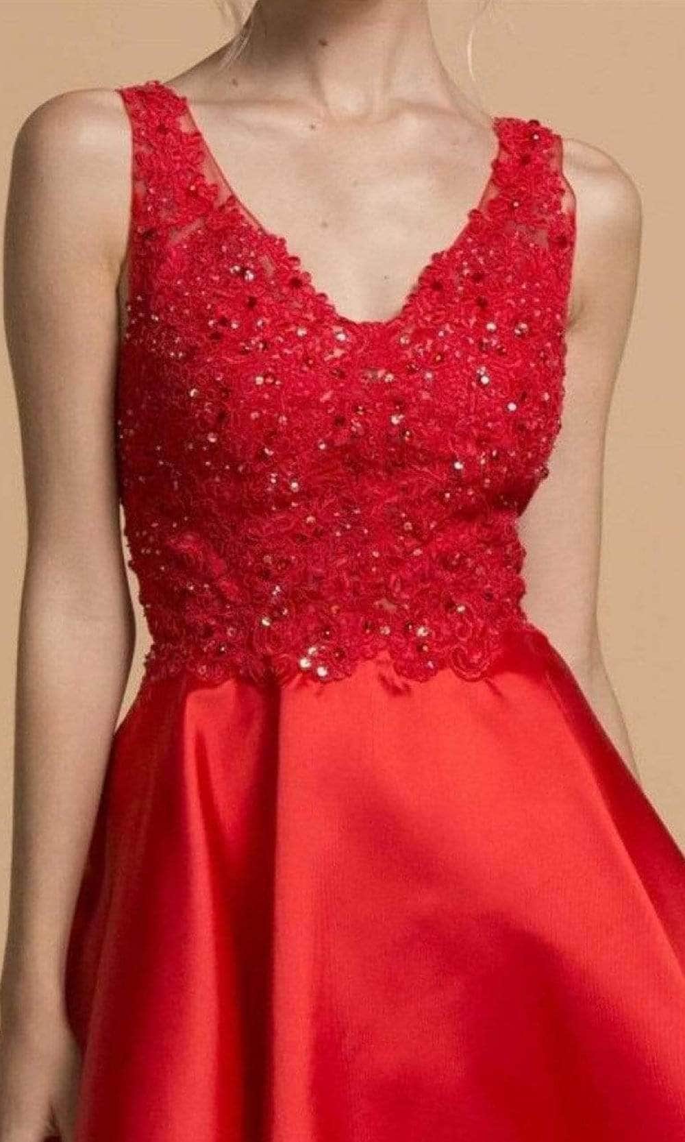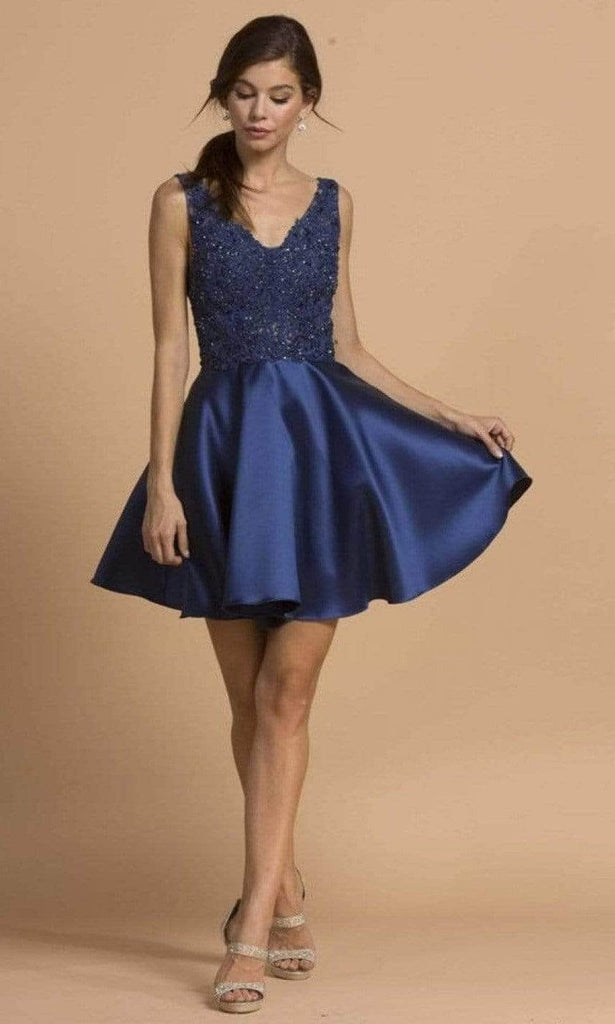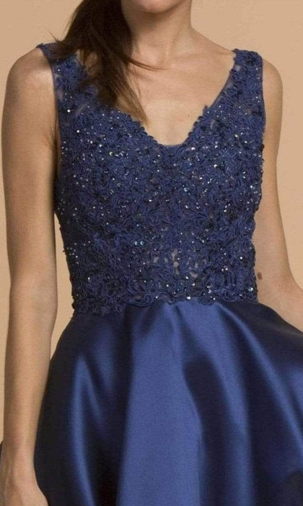 Aspire to become the belle of the ball in this Trevi Collection S2108 creation. Shimmering with rhinestones on a floral embroidered bodice, this dress parades a v-neckline on a sleeveless bodice. Rendered with a deep scoop back. the sleek skirt flares into a short hemline. Showcase your passion for the stylish in this Trevi Collection masterpiece. Models are wearing the Navy and Red colors.