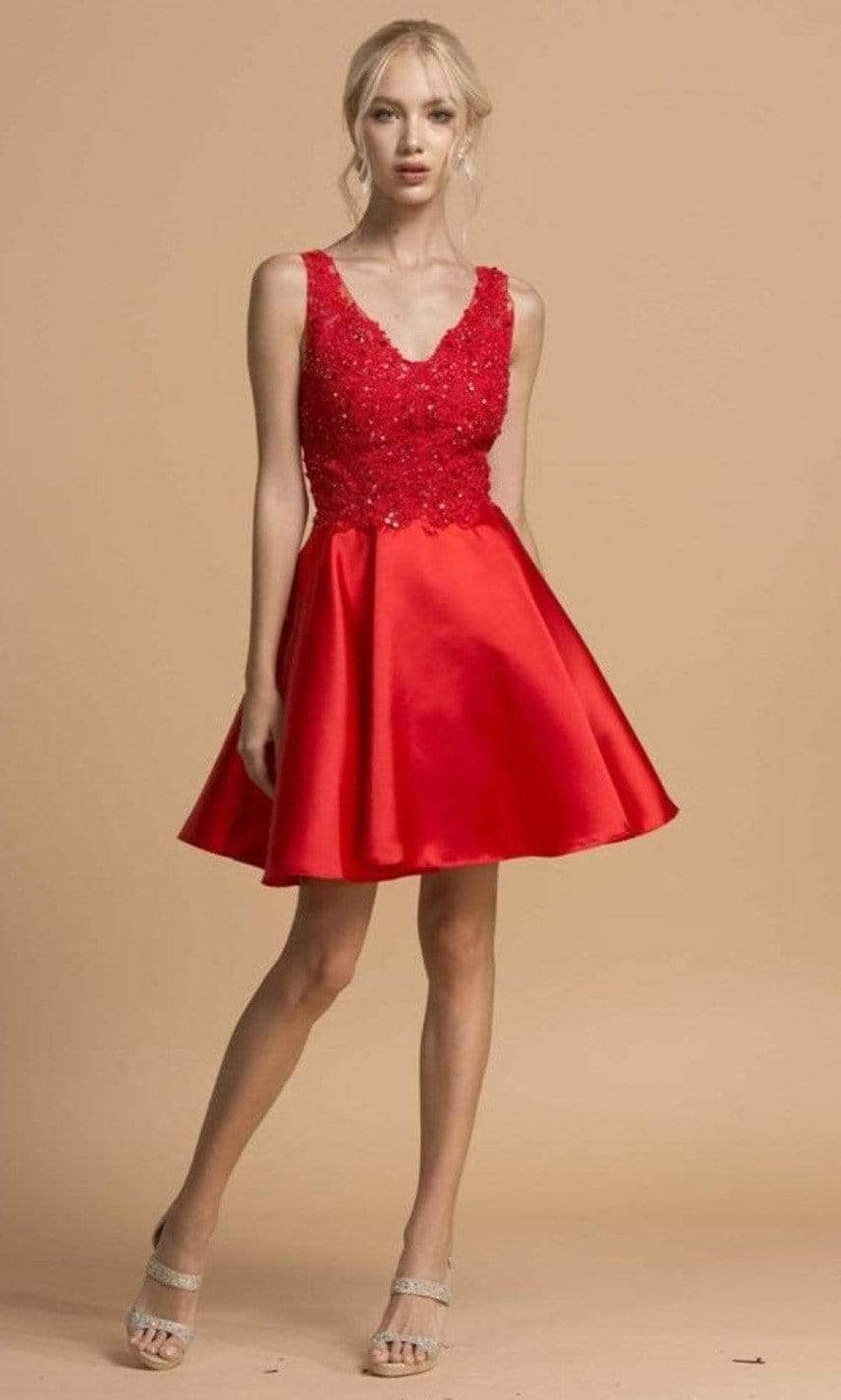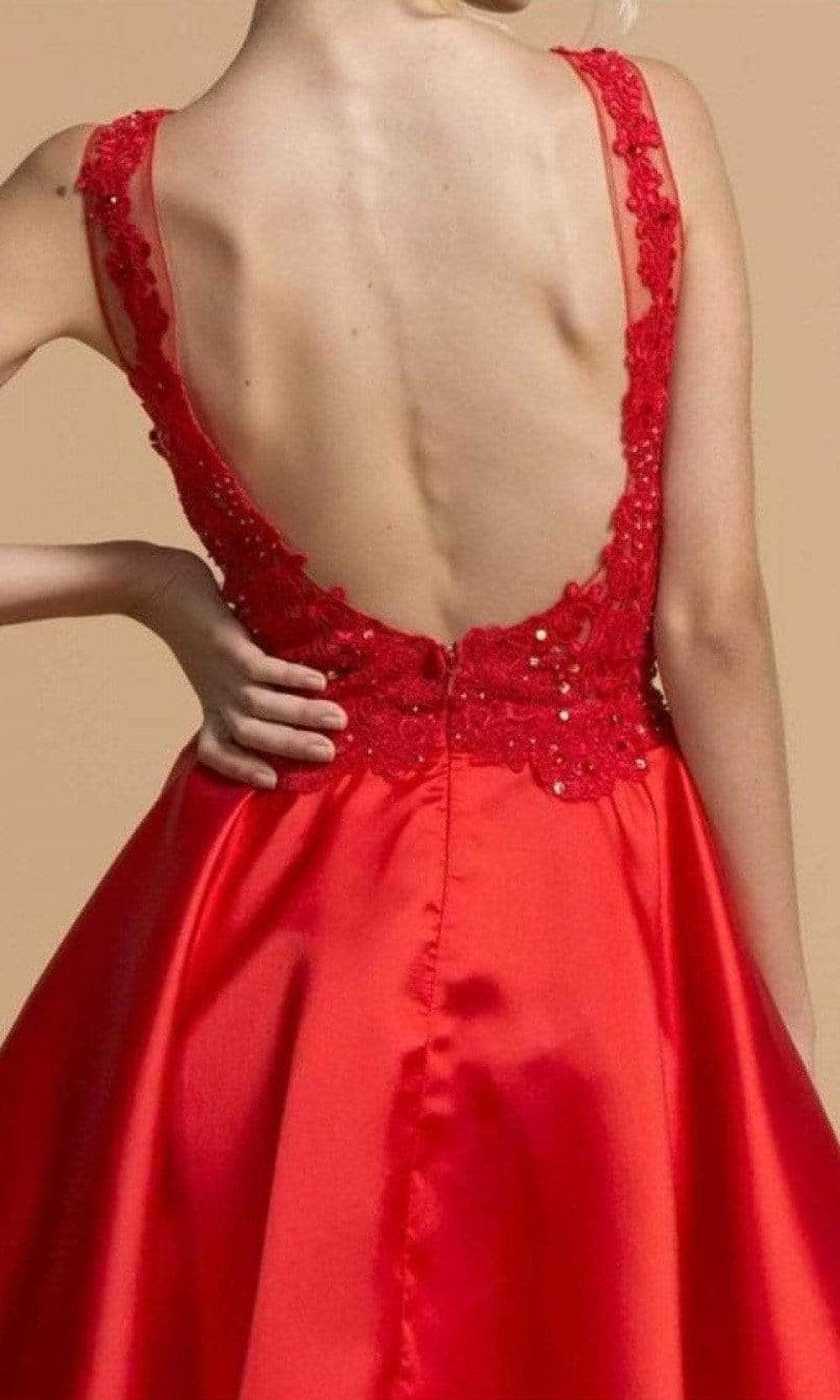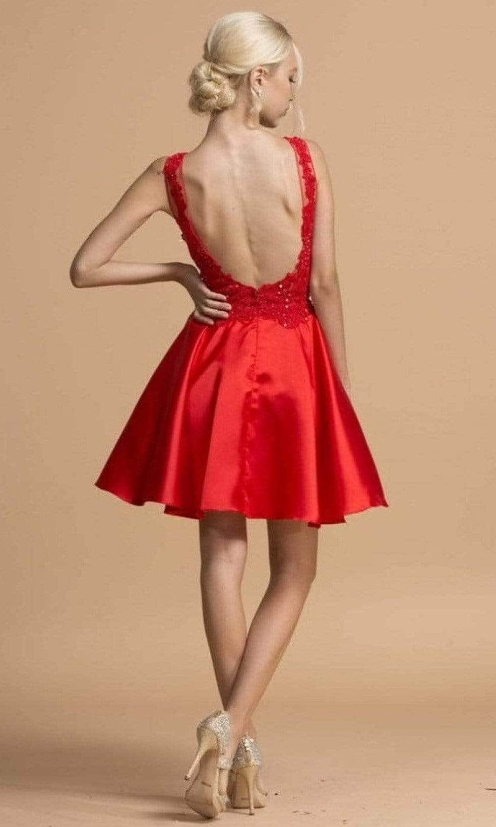 Aspire to become the belle of the ball in this Trevi Collection S2108 creation. Shimmering with rhinestones on a floral embroidered bodice, this dress parades a v-neckline on a sleeveless bodice. Rendered with a deep scoop back. the sleek skirt flares into a short hemline. Showcase your passion for the stylish in this Trevi Collection masterpiece. Models are wearing the Navy and Red colors.