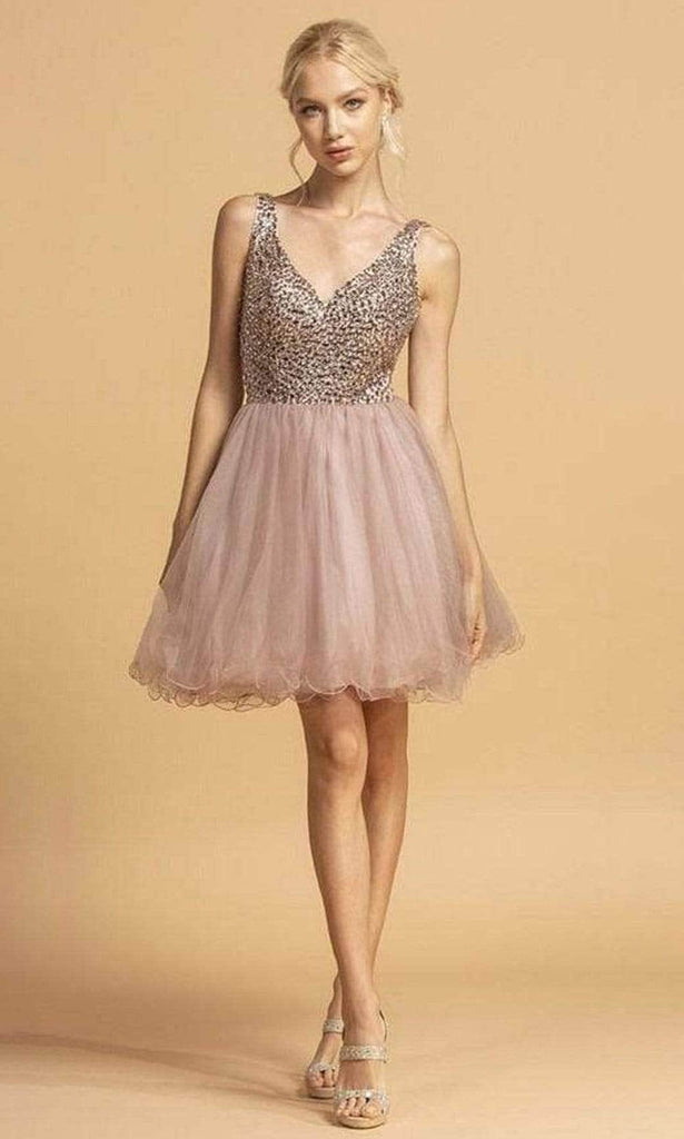 Expect to be turning heads as you walk by in this Trevi Collection S2114 creation. Flatteringly glinting with crystal-embellished bodice, this sleeveless dress charms with a v-neckline with a low scoop back. The tulle skirt flares into a short curled hem. Look like perfection in this beautiful Trevi Collection masterpiece. Models are wearing the Mauve, and Slate Blue colors.
