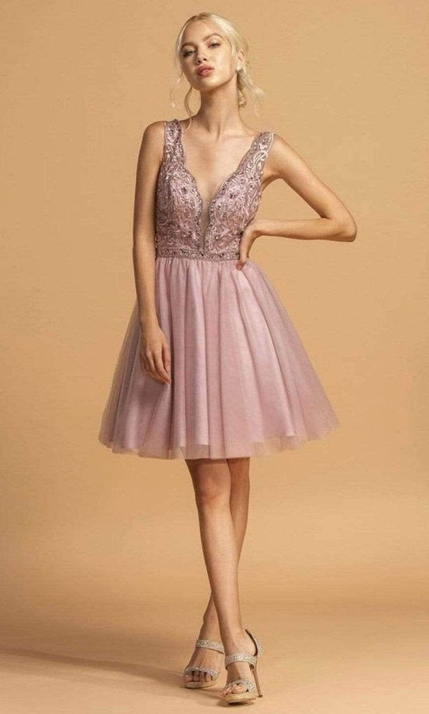 Shine through the night in this mesmerizing Trevi Collection S2119. This highly embellished cocktail dress is designed with striking embroidery details with beads on the outline of scallop detailing. It features plunging neckline and V back on a fit bodice and then paired with a flared short A-line silhouette using tulle fabric. Trevi Collection will make sure you turn heads all night long.