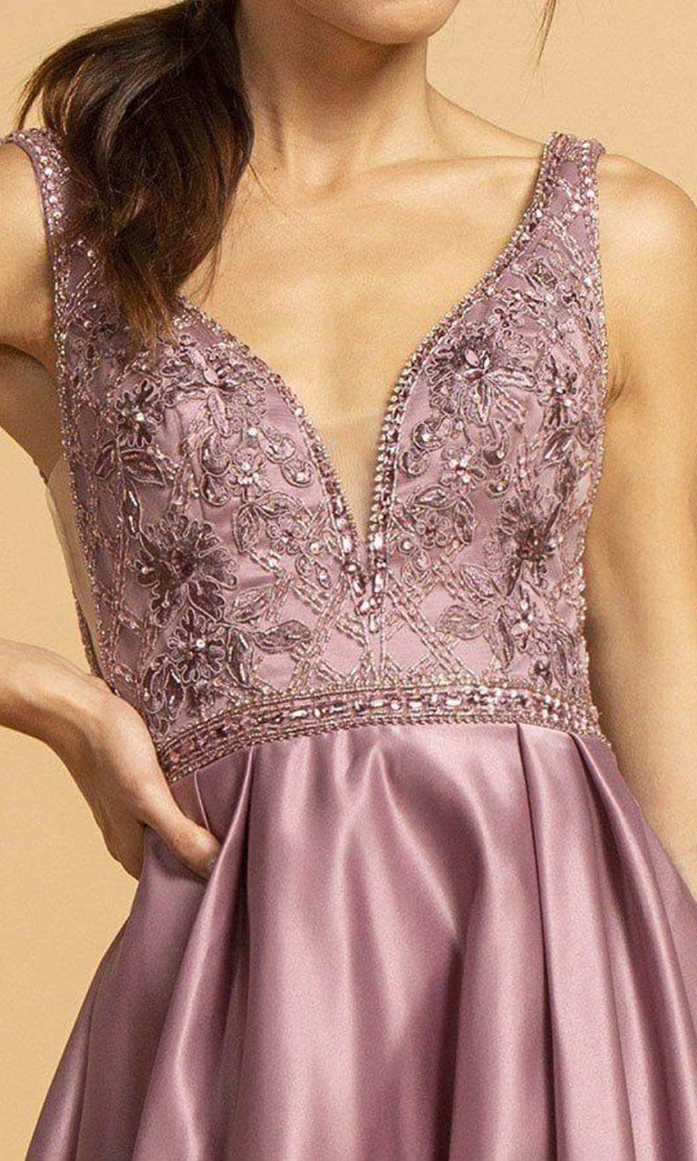 | Details: | Satin, Sleeveless, Beaded, Embroidery, Illusion Inset, V-Open Back, Zipper Closure, Pockets, Short Hem |