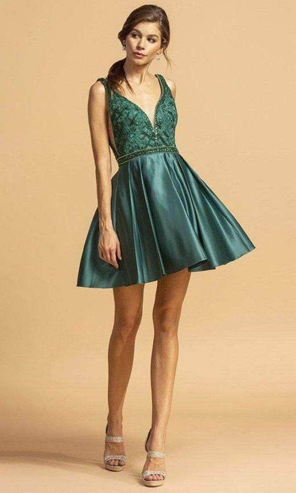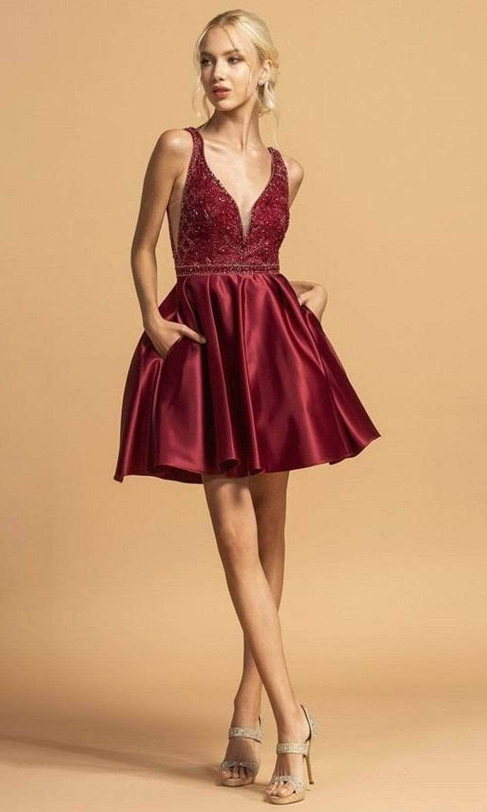 Strut your stuff in this absolutely lovely creation from Trevi Collection S2139. Trimmed with beadwork and accented with embroidery, this sleeveless dress shows a plunging v-neckline paired with sheer insets. The back showcases a deep v-style as beadwork trims the waist. The satin skirt creates a short sleek silhouette. Unleash an inner glamour that attracts all eyes to you in this Trevi Collection S2139 cocktail dress. Models are wearing the Burgundy, Hunter Green, Mauve, and Navy colors.