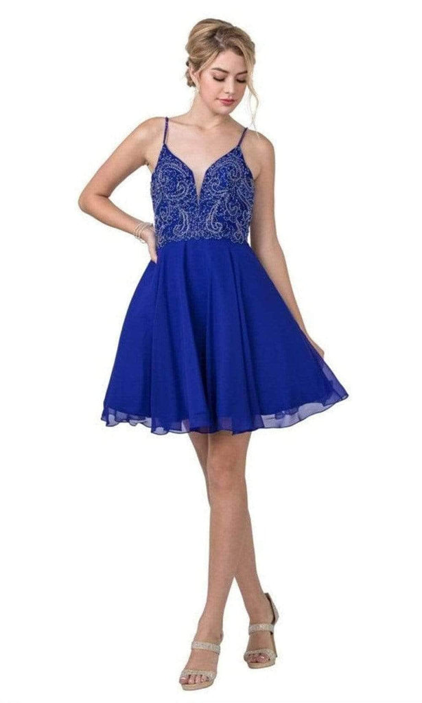 Get noticed in any crowd wearing this Trevi Collection S2298 cocktail dress. This dress showcases a plunging V-neckline supported by spaghetti straps in a sleeveless and beaded bodice. The skirt reveals an A-line silhouette while having a V Back with back zipper closure. Make it a night to remember with this Trevi Collection creation. Model is wearing Royal Blue color.