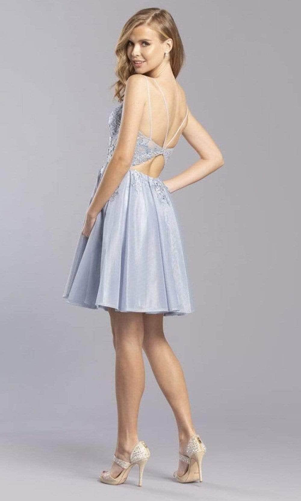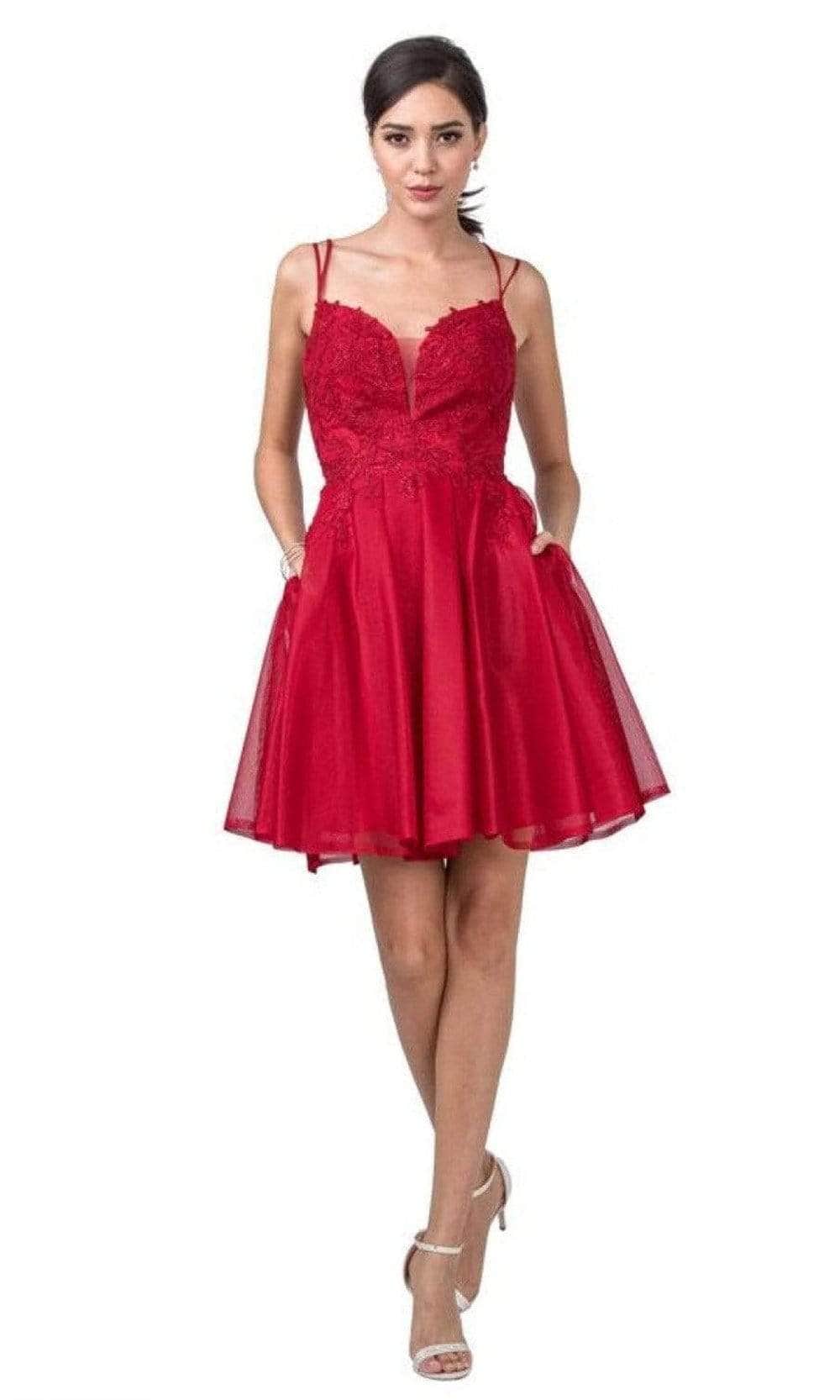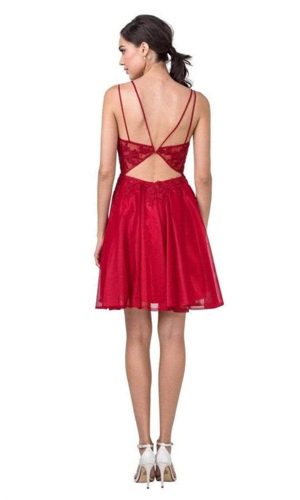 Look sophisticated and mature in this simple yet chic Trevi Collection S2318 dress. This dress highlights a plunging sweetheart neckline supported by thin straps in a sleeveless beaded and embroidered bodice. Revealing an A-Line silhouette finishing down to its mid-thigh length, this also displays a mid-open back with back zipper closure. Look and feel glamorous in this Trevi Collection creation.