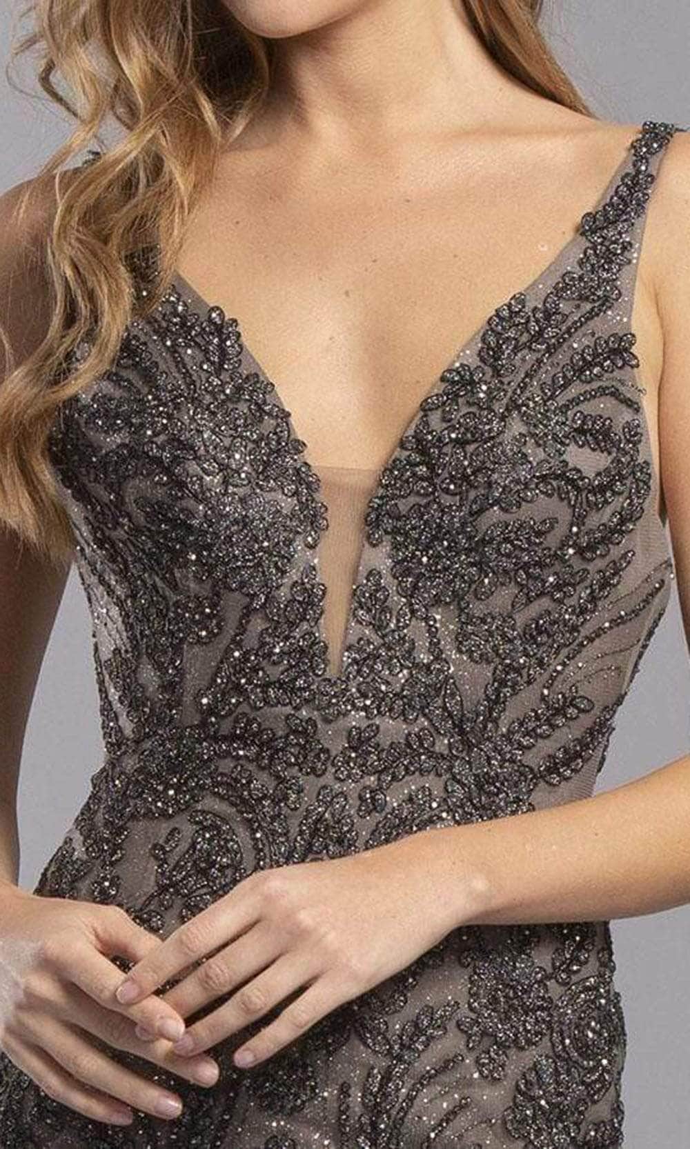 Wrap yourself in a captivating design that garners compliments with the Trevi Collection S2326 creation. Crafted in a shimmering silhouette adorned with beadwork and appliques, this sleeveless dress features a plunging V-neckline complemented by a sheer inset. Delicate thin straps extend into a midrise back. The sheath skirt gently hugs the figure, culminating in a short hemline. Command attention with this impeccably styled masterpiece from Trevi Collection S2326 and steal the spotlight effortlessly. Models are wearing the Charcoal and Mauve colors.