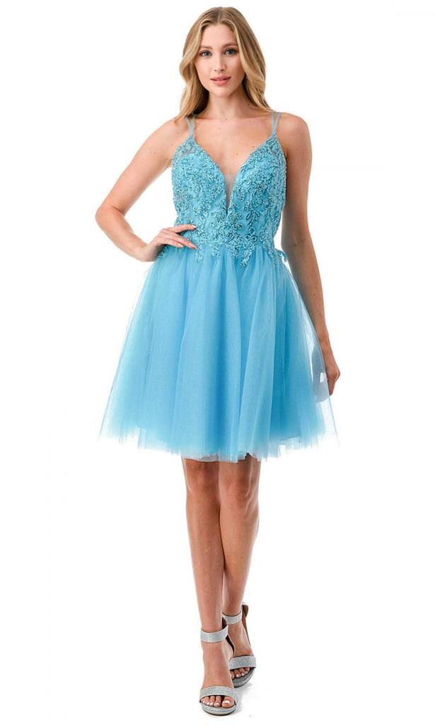 Charm everyone when you make your entrance in this cocktail dress by Trevi Collection S2648. Designed to make a stylish statement, this sleeveless dress is embellished with sparkling beadwork and embroidery on the top bodice. The plunging v-neckline has sheer inset detail on the bust and dual spaghetti straps for support. The dress's low-cut back reveals a peek of skin and is secured by a center zipper closure. The skirt is layered with glitter tulle fabric and has a short A-line silhouette. Dance and enjoy your next special party or event in this short, sassy and trendy Trevi Collection S2648 creation. Models are wearing the Light Blue, and Royal colors.