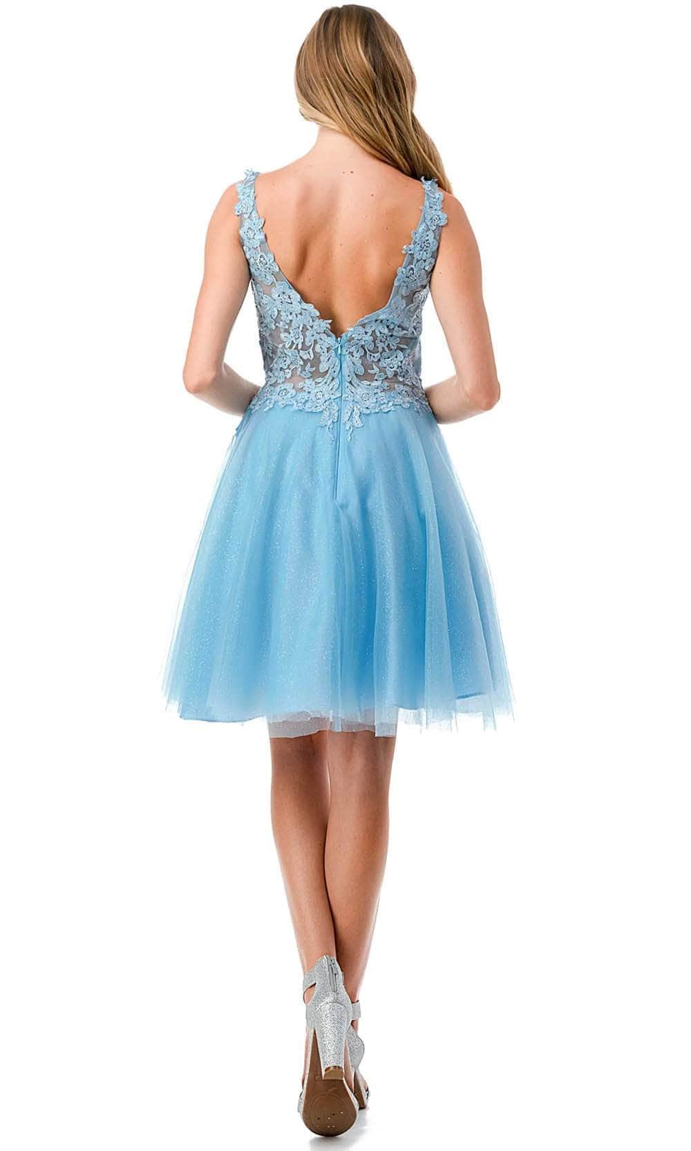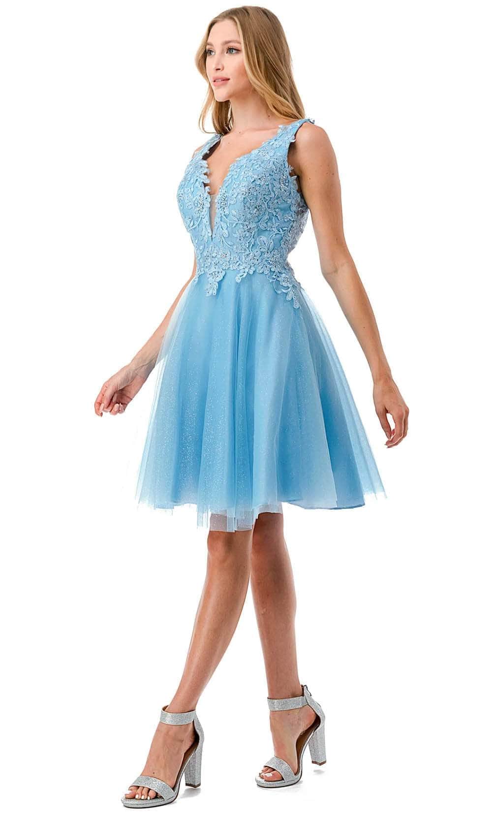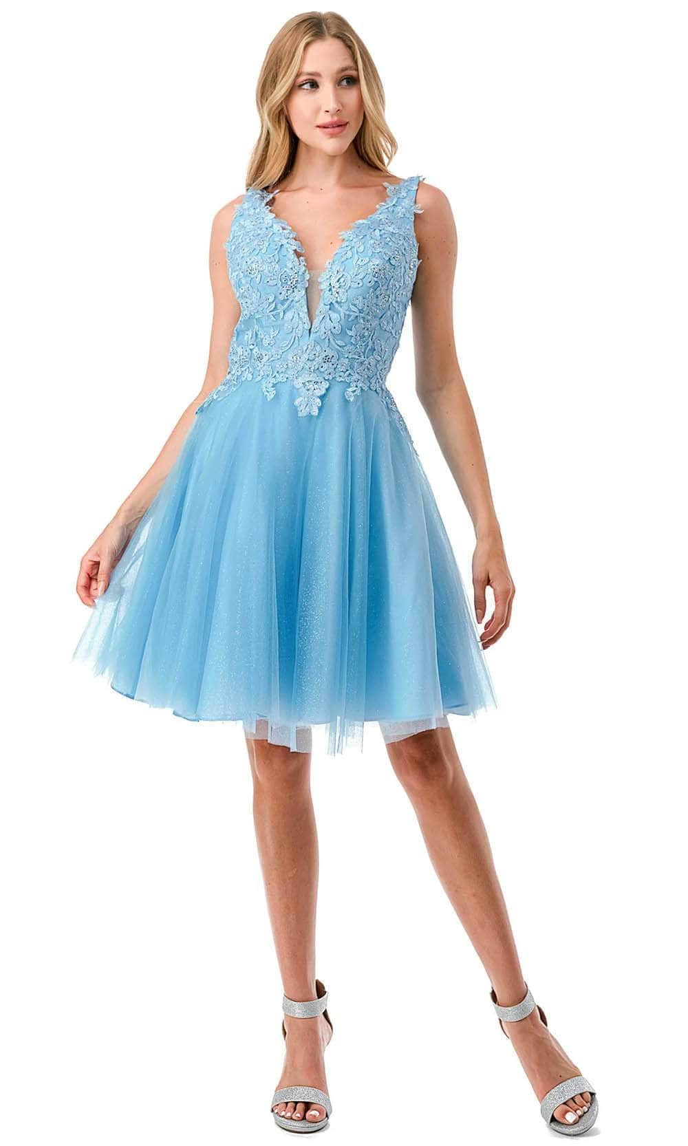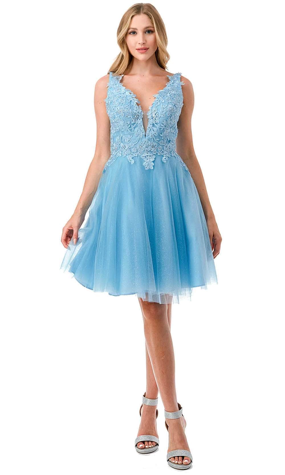 Unveil a high-class demeanor while revealing under a radiant glow in this Trevi Collection S2739J creation. Stunningly crusted with floral lace appliques sprinkled with rhinestone details, this gorgeous piece flaunts a sleeveless bodice with a plunging v-neckline and an overlaying illusion inset. Gorgeously ornate with floral accents, the back has a v-style opening with a zipper closure. The skirt is beautifully layered as it forms an A-line design with a mini hemline. Crown yourself with a radiant aura in this exquisitely made Trevi Collection S2739J masterpiece. Model is wearing the Sky Blue color.