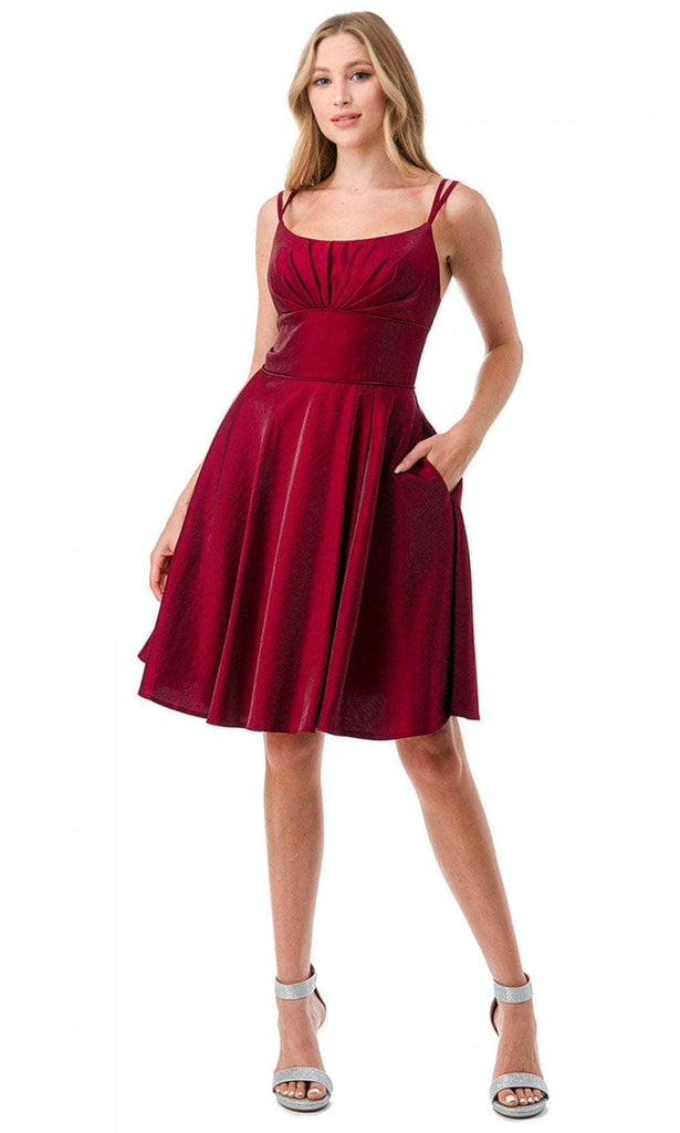 Exude a charm that is meant to mesmerize the elite crowd in this gorgeous Trevi Collection S2741M dress. This timeless style presents a sleeveless bodice topped by a ruched scoop neckline, wide waistband and dual spaghetti straps. The back is designed in a mid-open detail with a strappy style and a center zipper closure. An A-line skirt gracefully drops to the short hemline and completes the look with side pockets to keep your belongings. This Trevi Collection S2741M creation will absolutely make you feel special! Models are wearing the Burgundy, Emerald, Mauve, and Royal colors.
