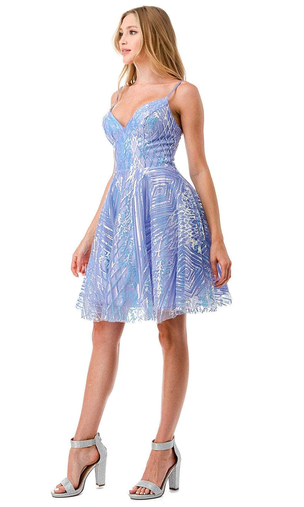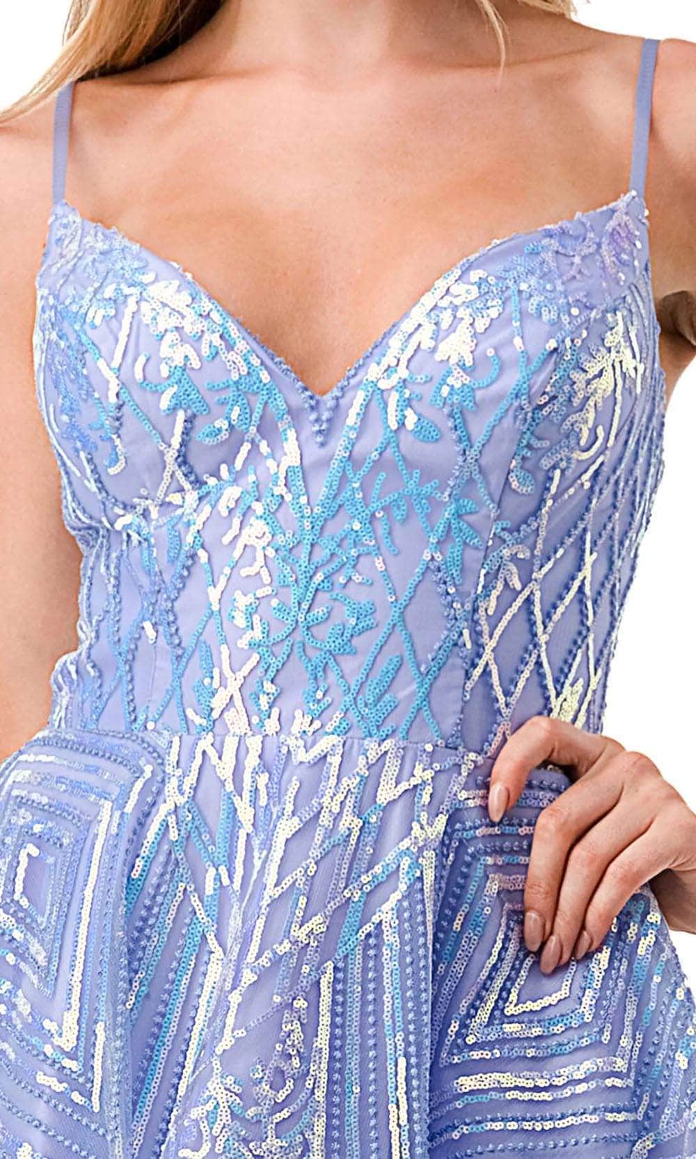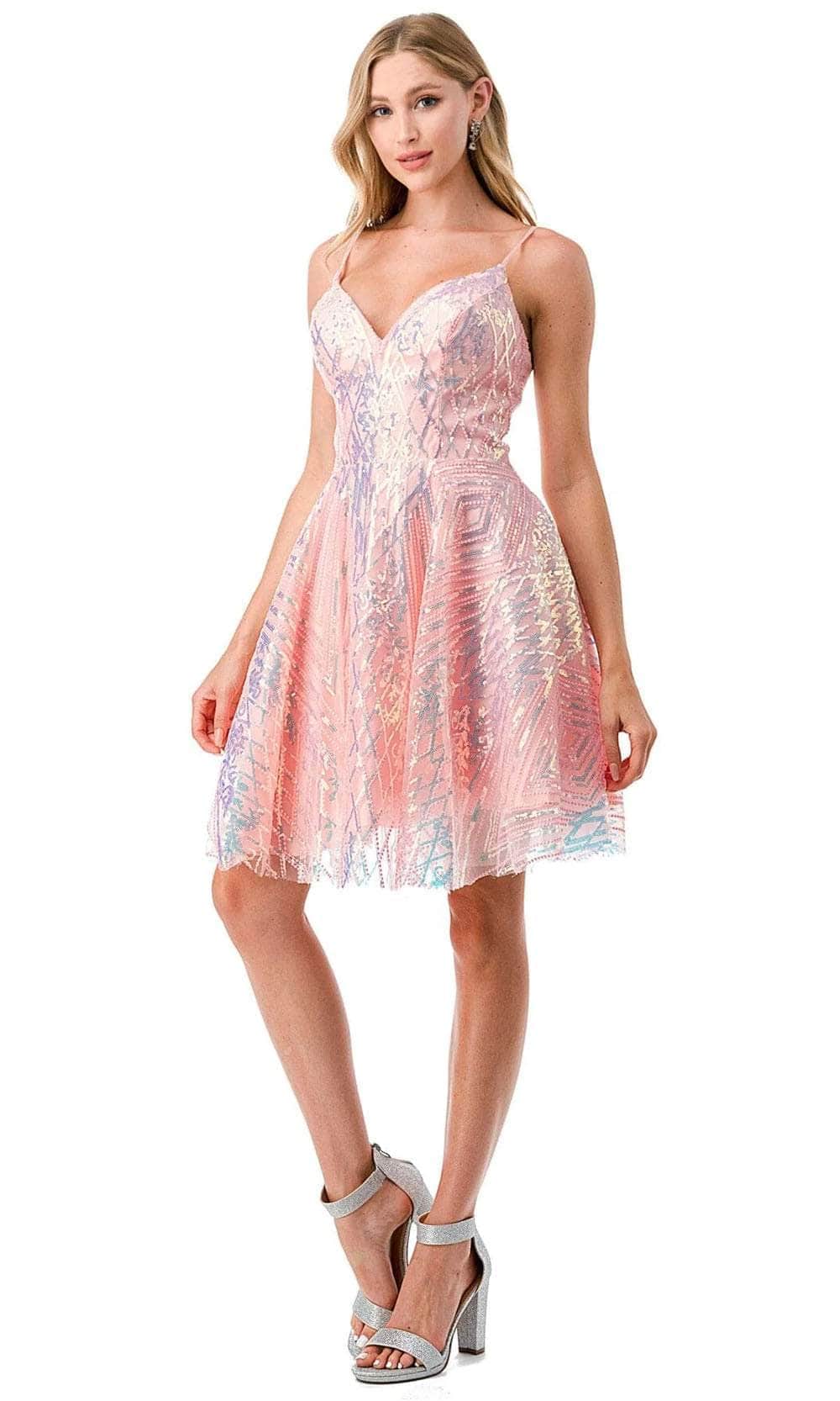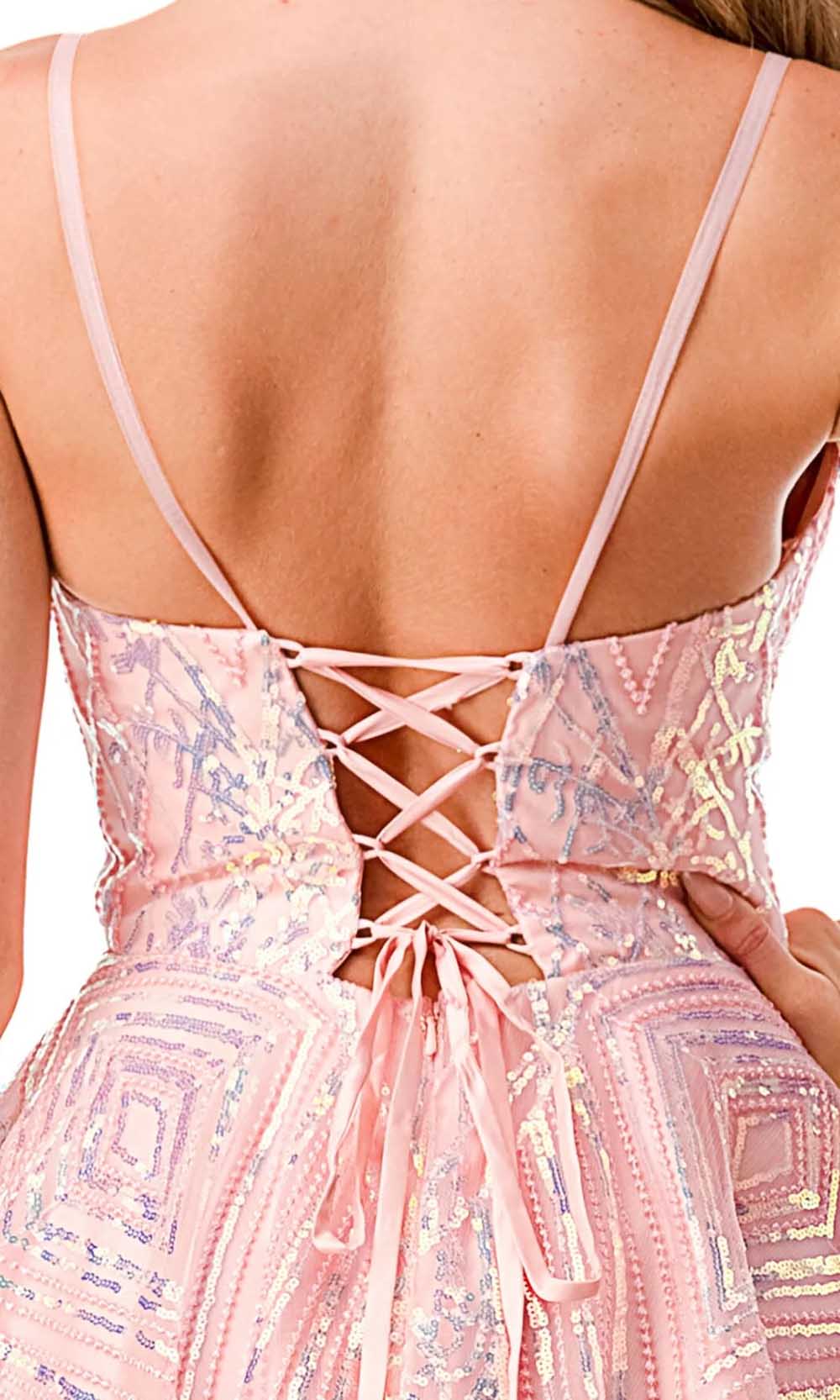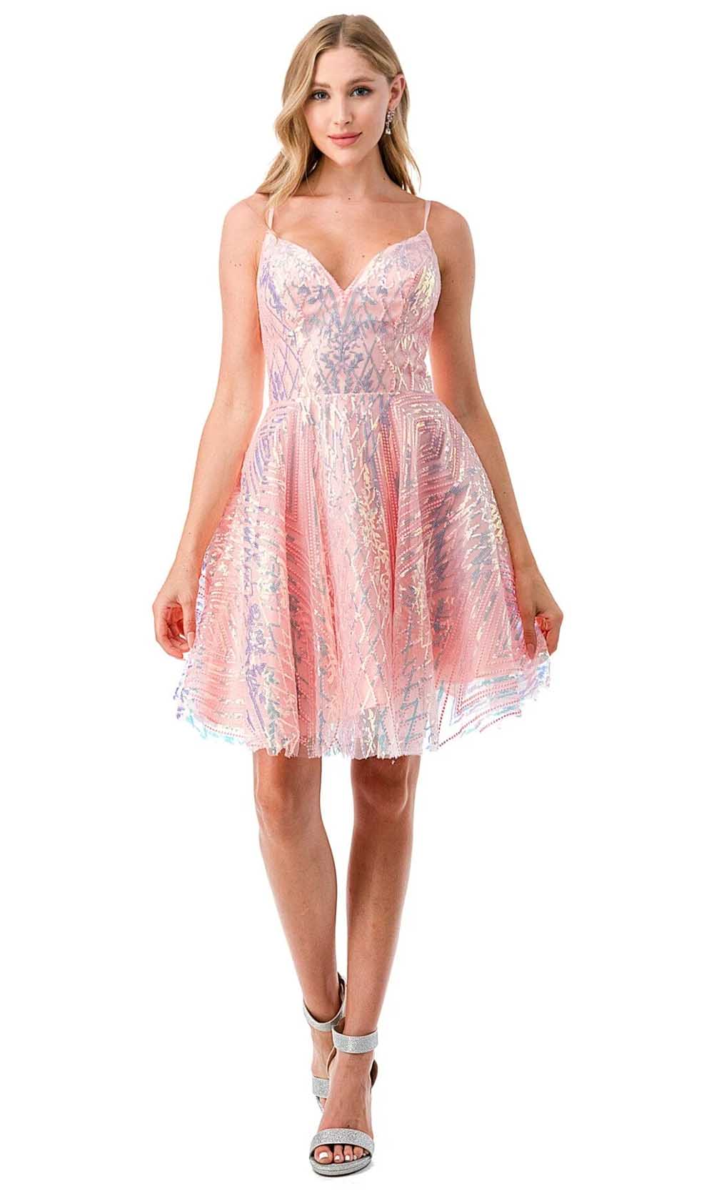 Be mesmerized by the dainty details and exceptional beauty of this exquisite Trevi Collection S2743M creation. Glinting with an intricate sequin pattern that flaunts a shimmering effect, this alluring piece flatters with a v-neckline on a seam tailored silhouette. Graced with delicate spaghetti straps and crafted with a corset back that ensures a perfect fit, the A-line skirt gracefully flows as it glimmers with beauty before ending with a mini hemline. Grace the event with an effortless combination of timeless charm and contemporary style in this Trevi Collection S2743M masterpiece. Models are wearing the Lilac and Pink colors.