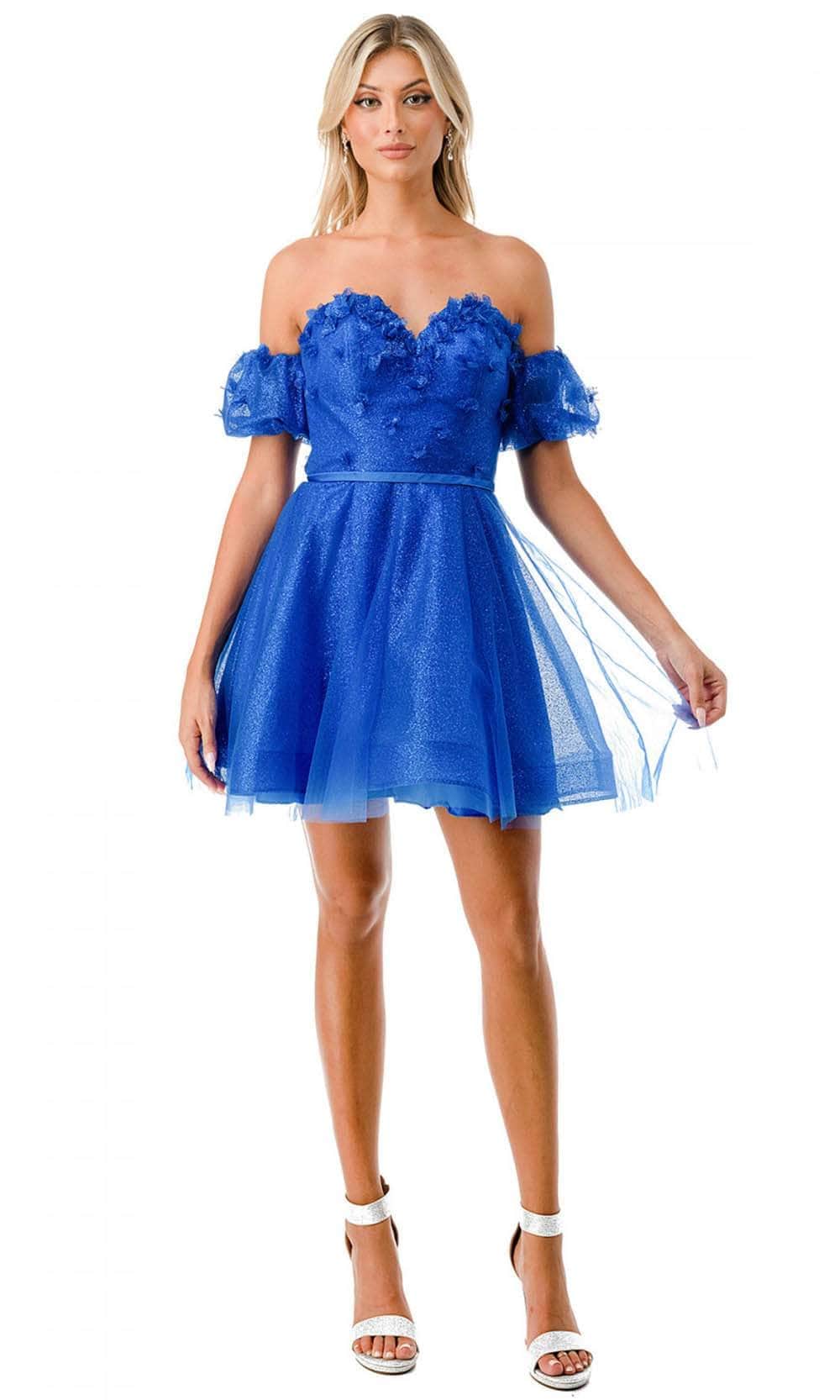 Shine like a star in Trevi Collection S2748B, a fabulous cocktail dress that epitomizes elegance and glamour. The gleaming fabric envelops you in a radiant aura, captivating all who behold you. The off-shoulder bodice, adorned with exquisite 3D appliqué, adds depth and texture, while the sweetheart neckline exudes a touch of romance. Clean seams and a bandeau back ensure a seamless fit, complemented by a back zipper closure. The short-length A-line skirt flows gracefully, allowing you to move with poise and confidence. This Trevi Collection S2748B is a true work of art, a perfect choice for turning heads and making a memorable statement on any special occasion. Model is wearing Royal Color.