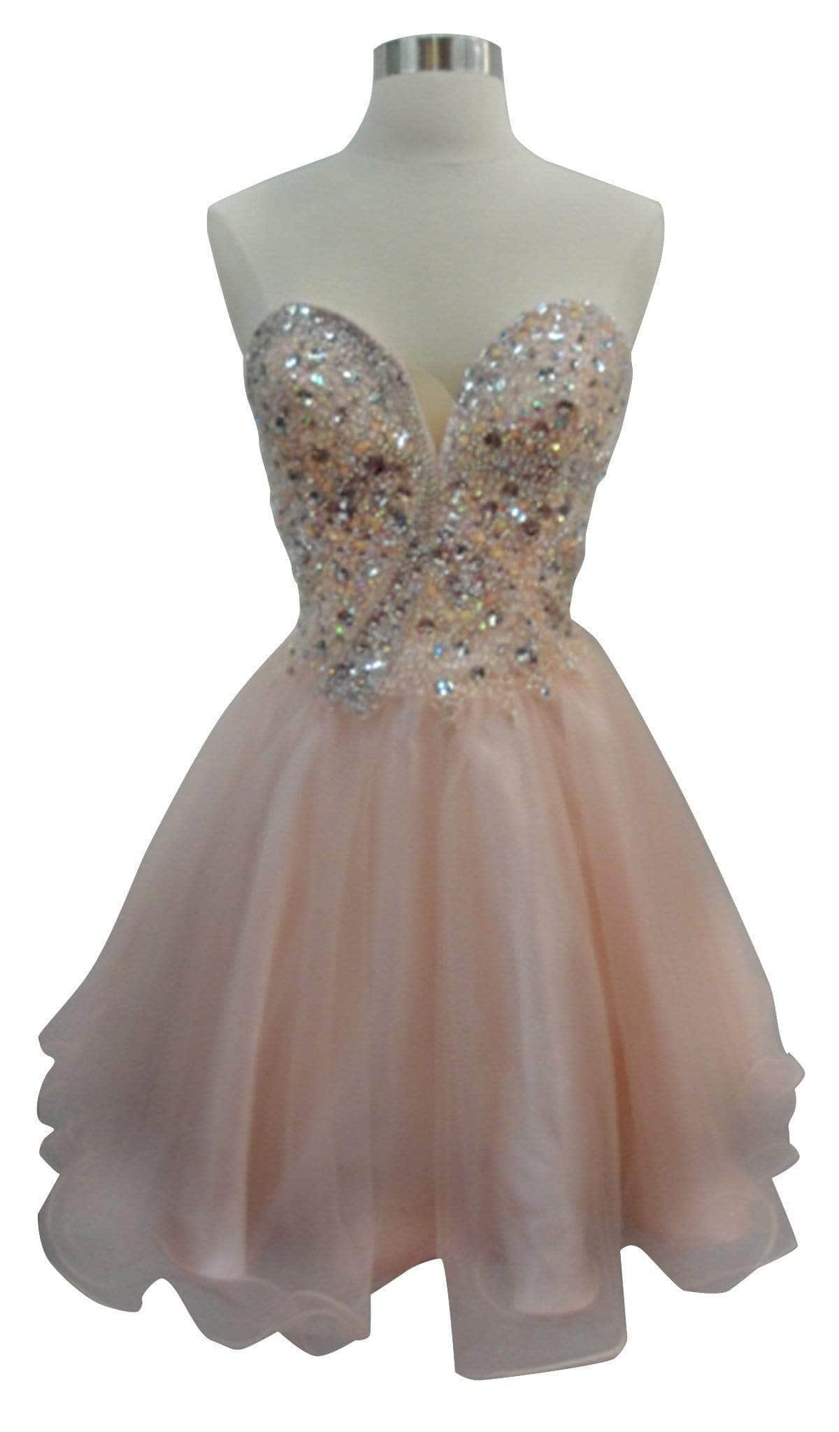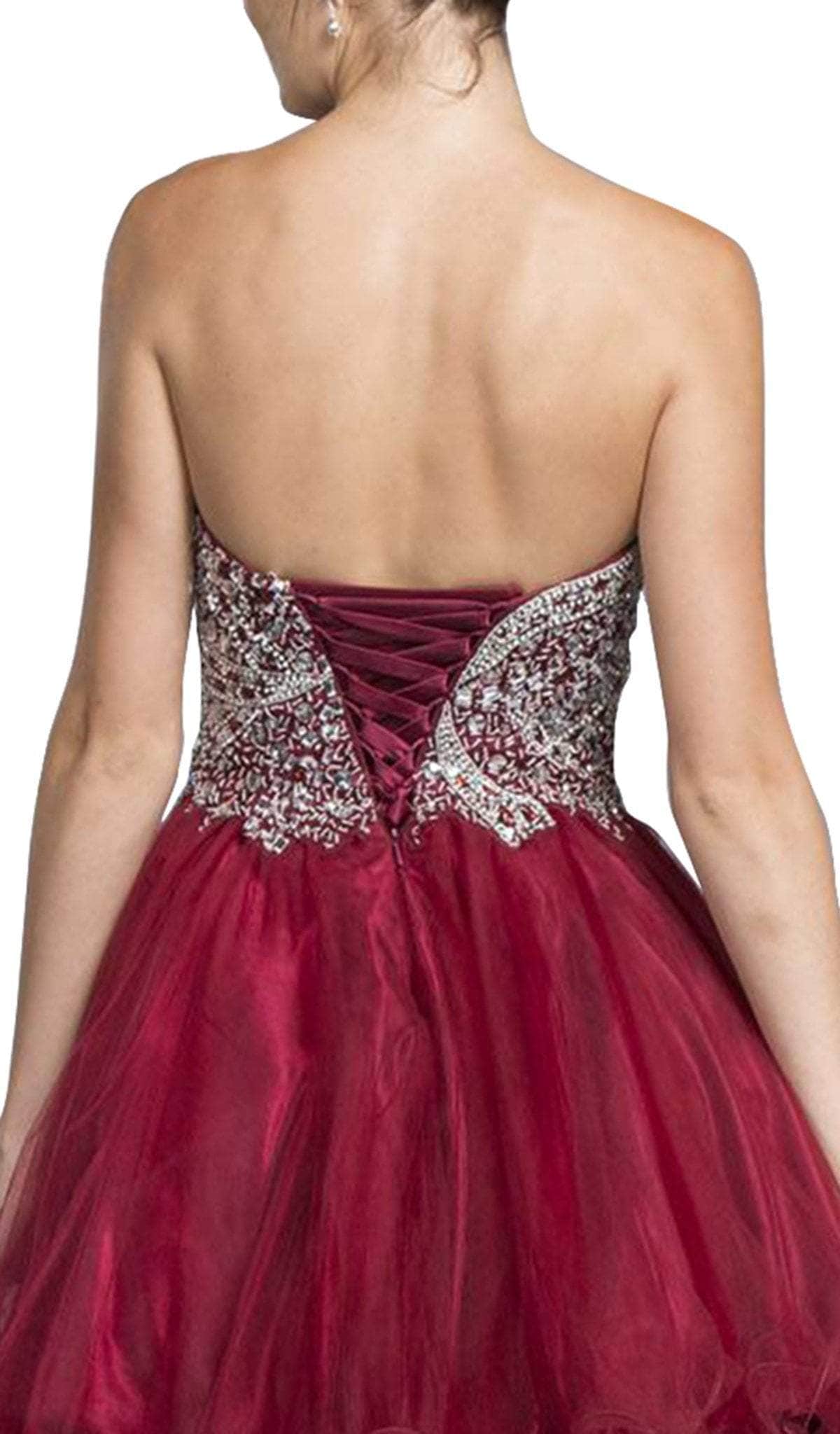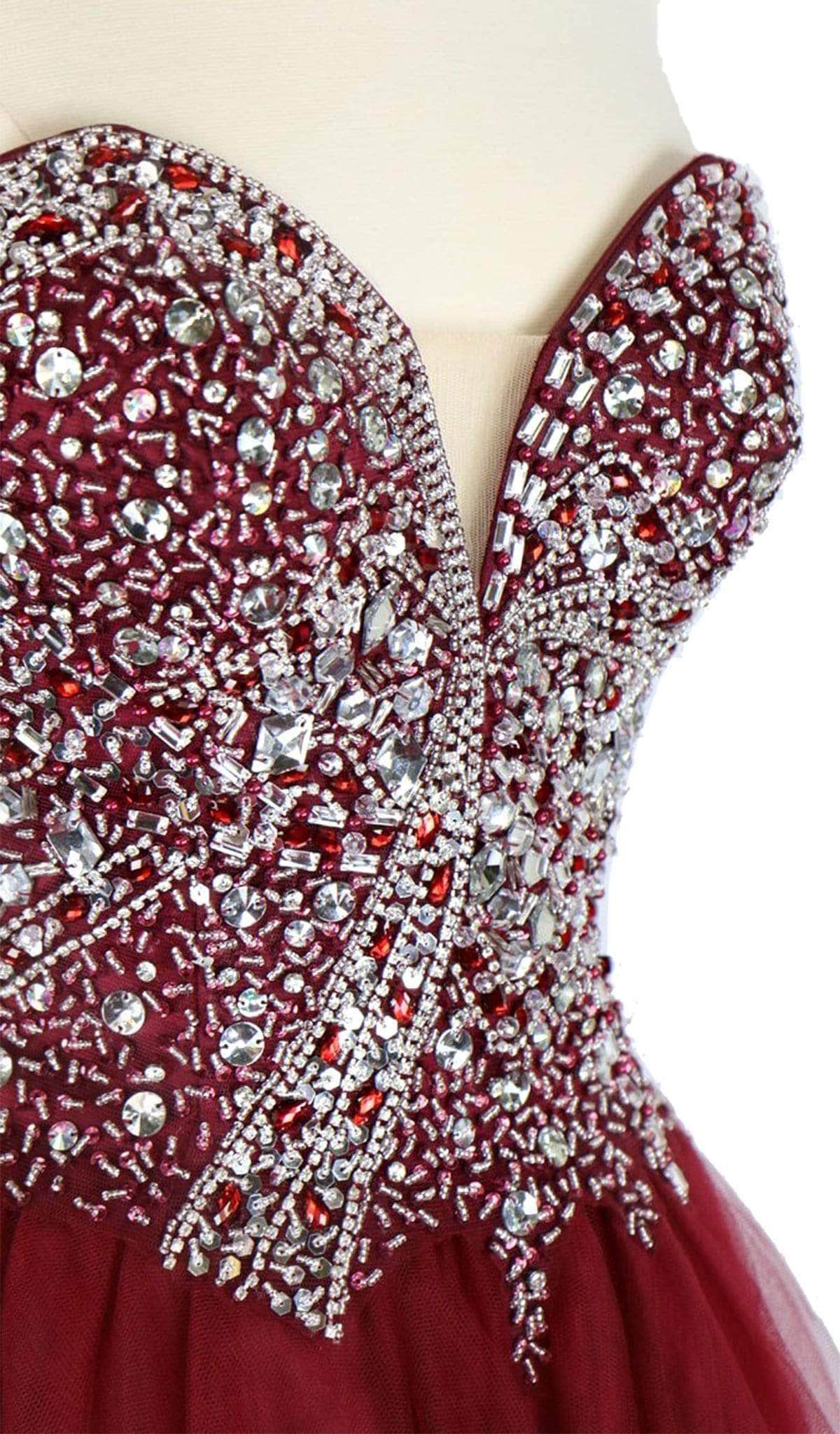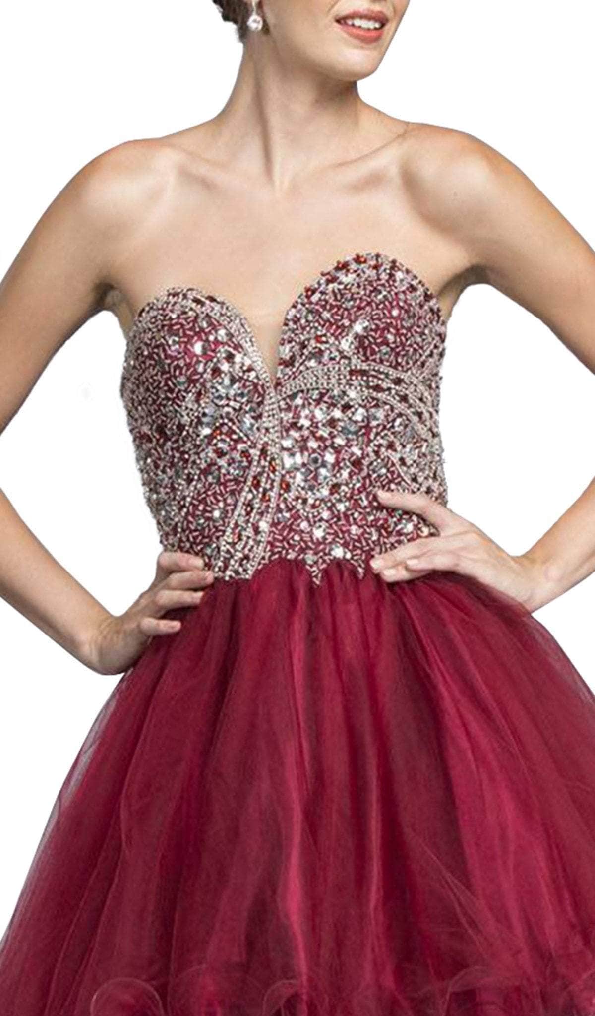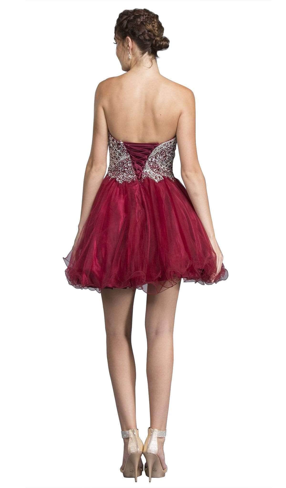Steal the spotlight in this short ensemble by Trevi Collection S1918. Brandishes in a strapless, sweetheart neckline with fitted bodice adorned with glittering jewel accents. The A-line skirt is styled with a curled hemline and runs at mid-thigh. Be ready to capture the spirit of that romantic evening in this Trevi Collection.