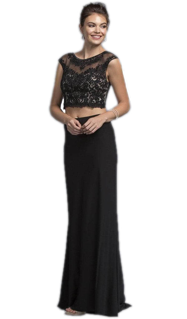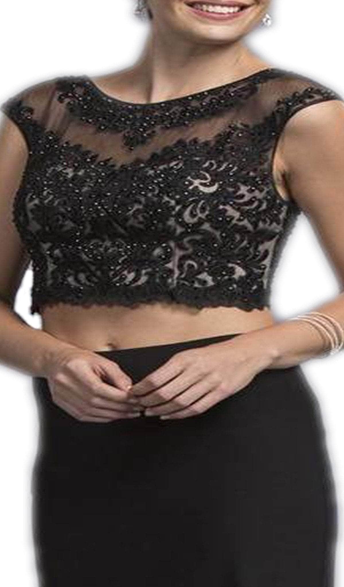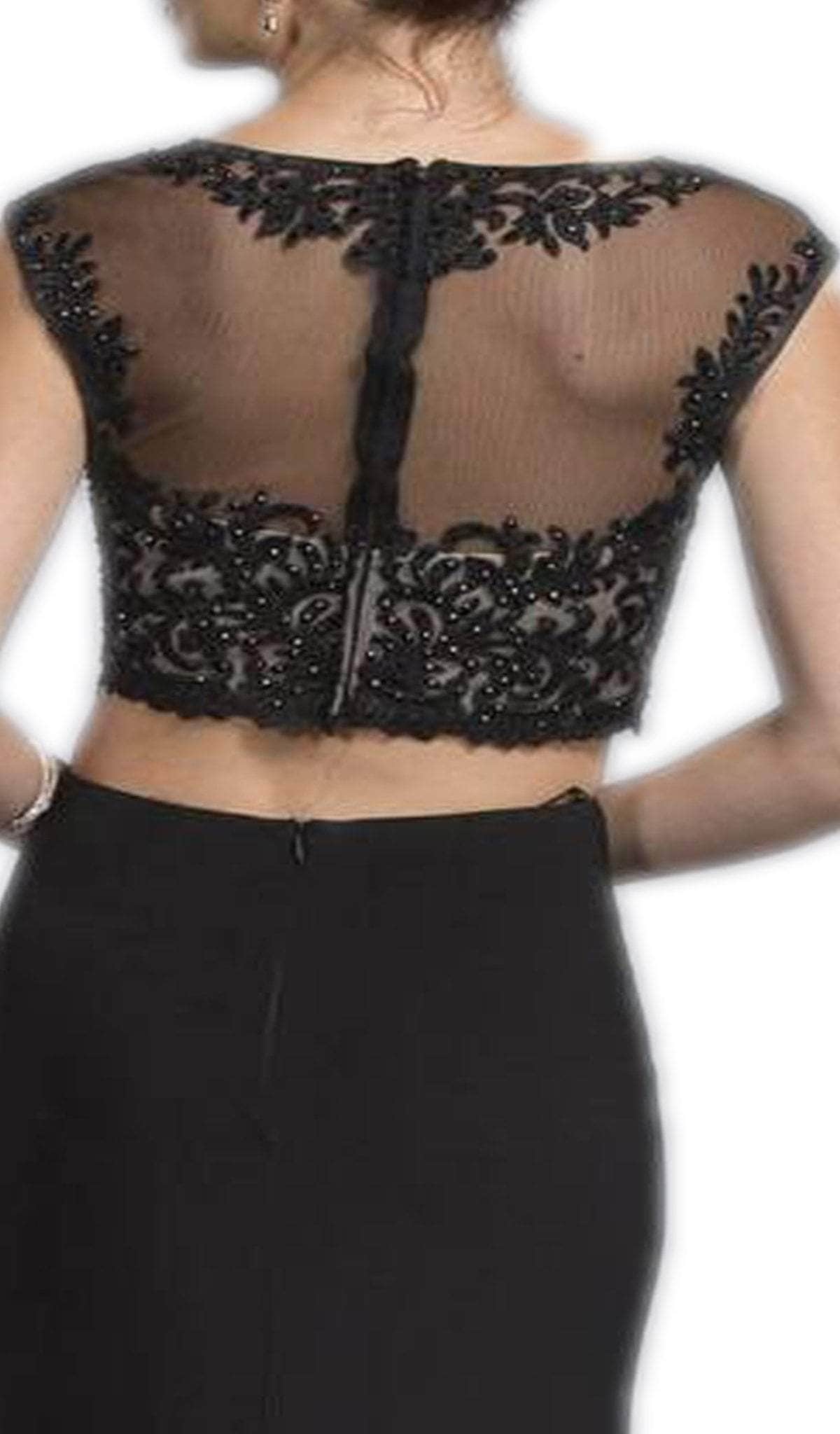 Walk with radiance and confidence in a two piece dress from Trevi Collection L2029. Features an illusion bateau neckline with cap sleeves. The sheer crop top is lavishly adorned with embellishments and shows a scalloped hemline. The sleek skirt has a fitted silhouette and runs in full length hem with a sweep train finish. This Trevi Collection ensemble has a timeless look suited for any formal party.