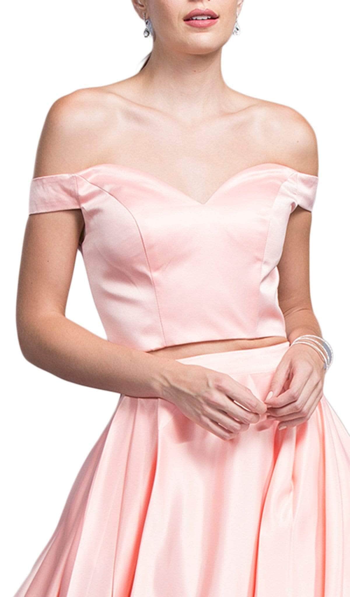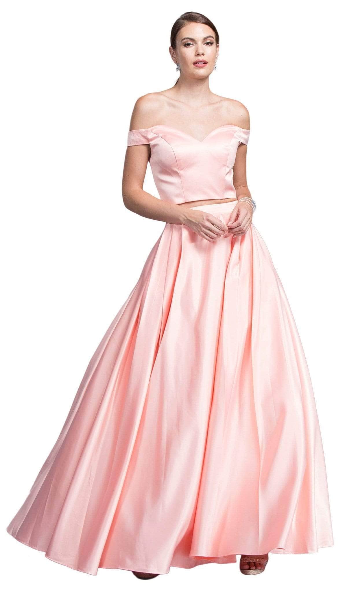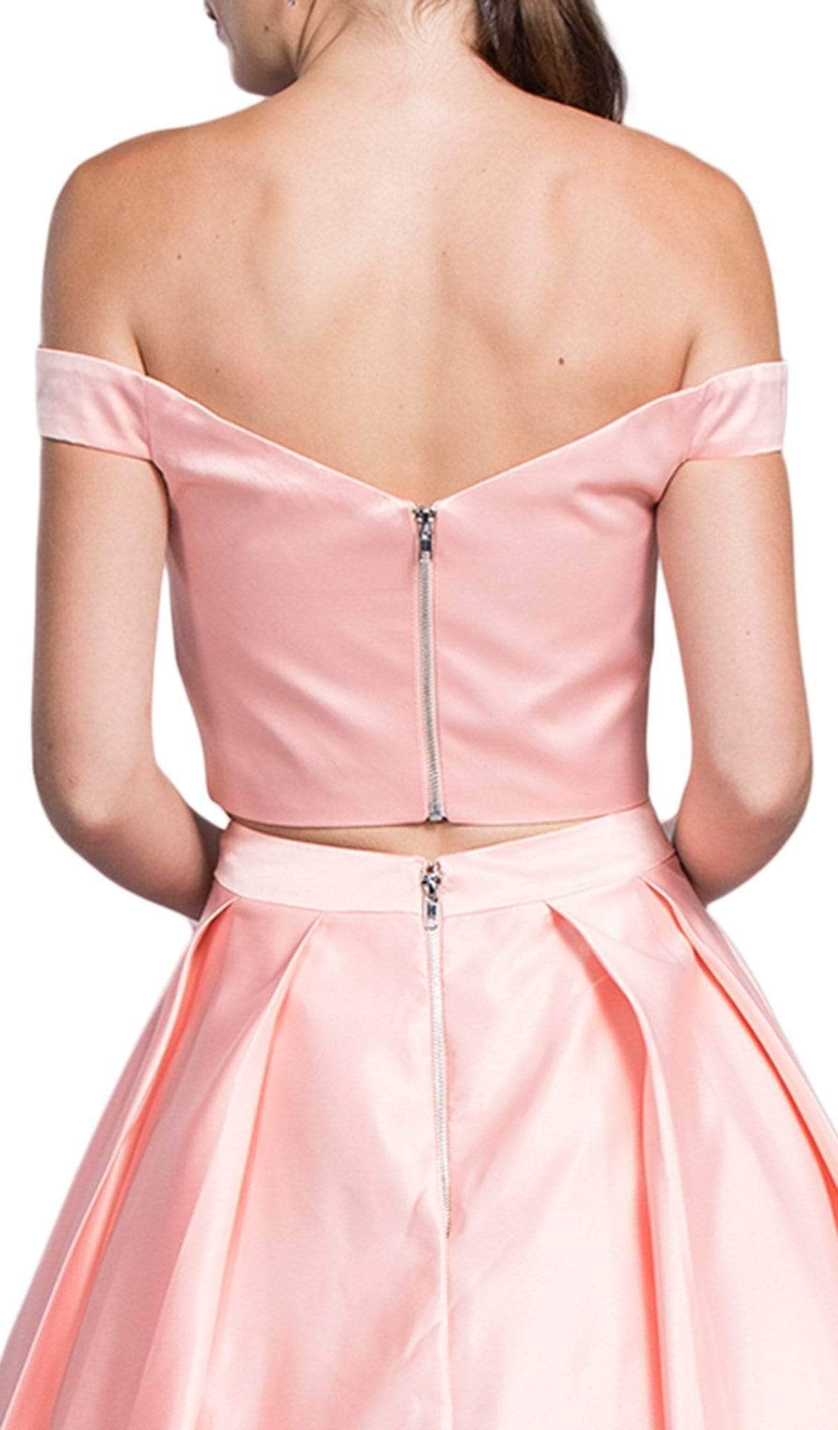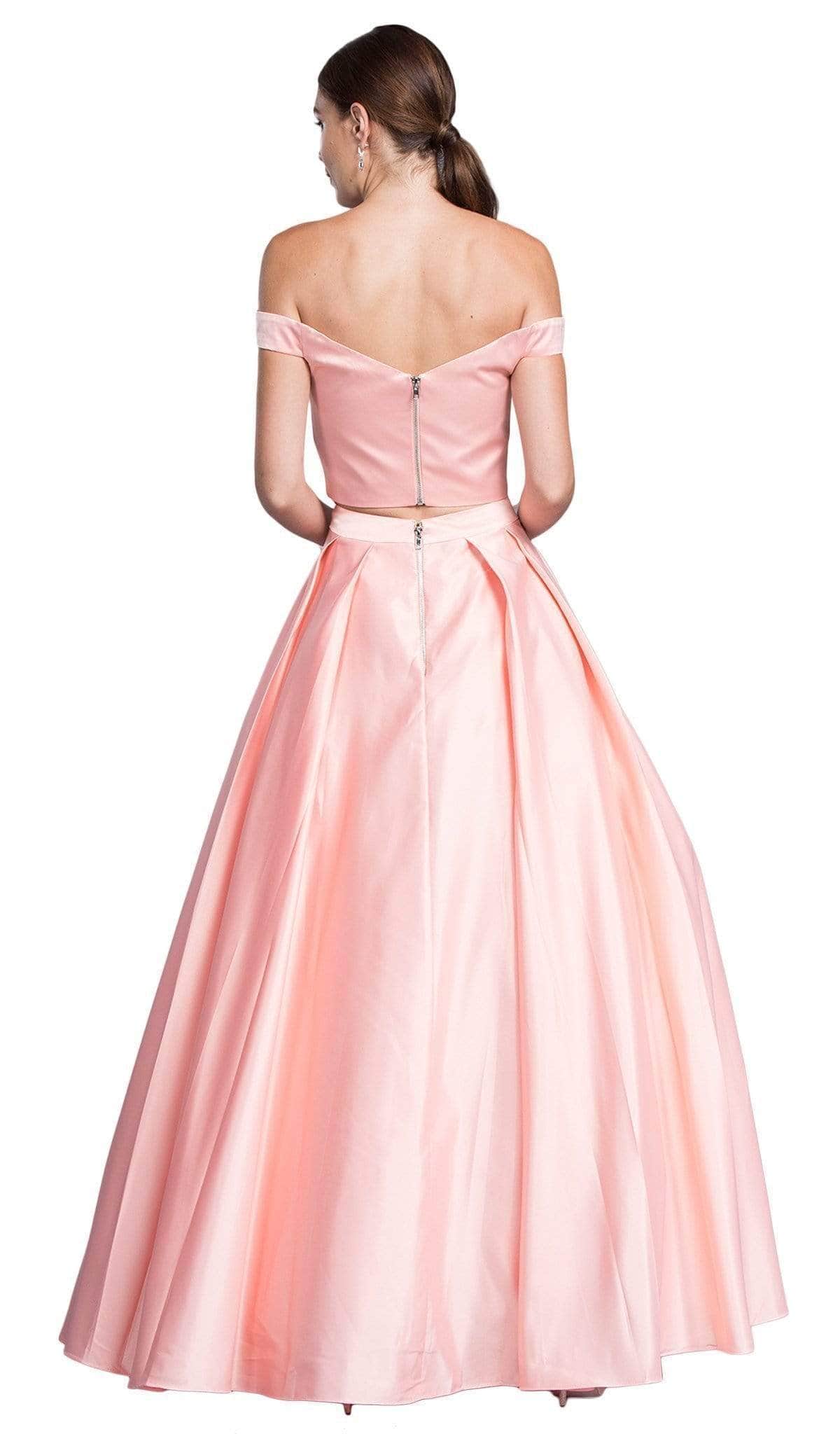 Show off your classy style when you wear this ballgown designed by Trevi Collection L1951. This two-piece gown presents in a crop top with an off the shoulder neckline and is styled with a back zipper closure. The skirt has a ballgown silhouette and runs in full length hem. This Trevi Collection two piece gown is perfect for any formal evening. Model is wearing Blush color.
