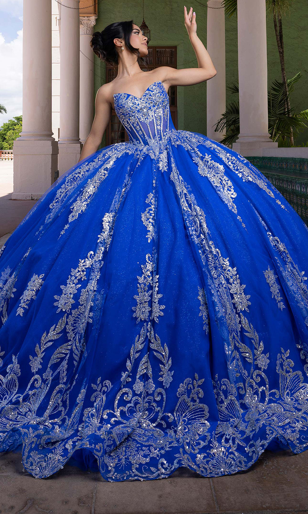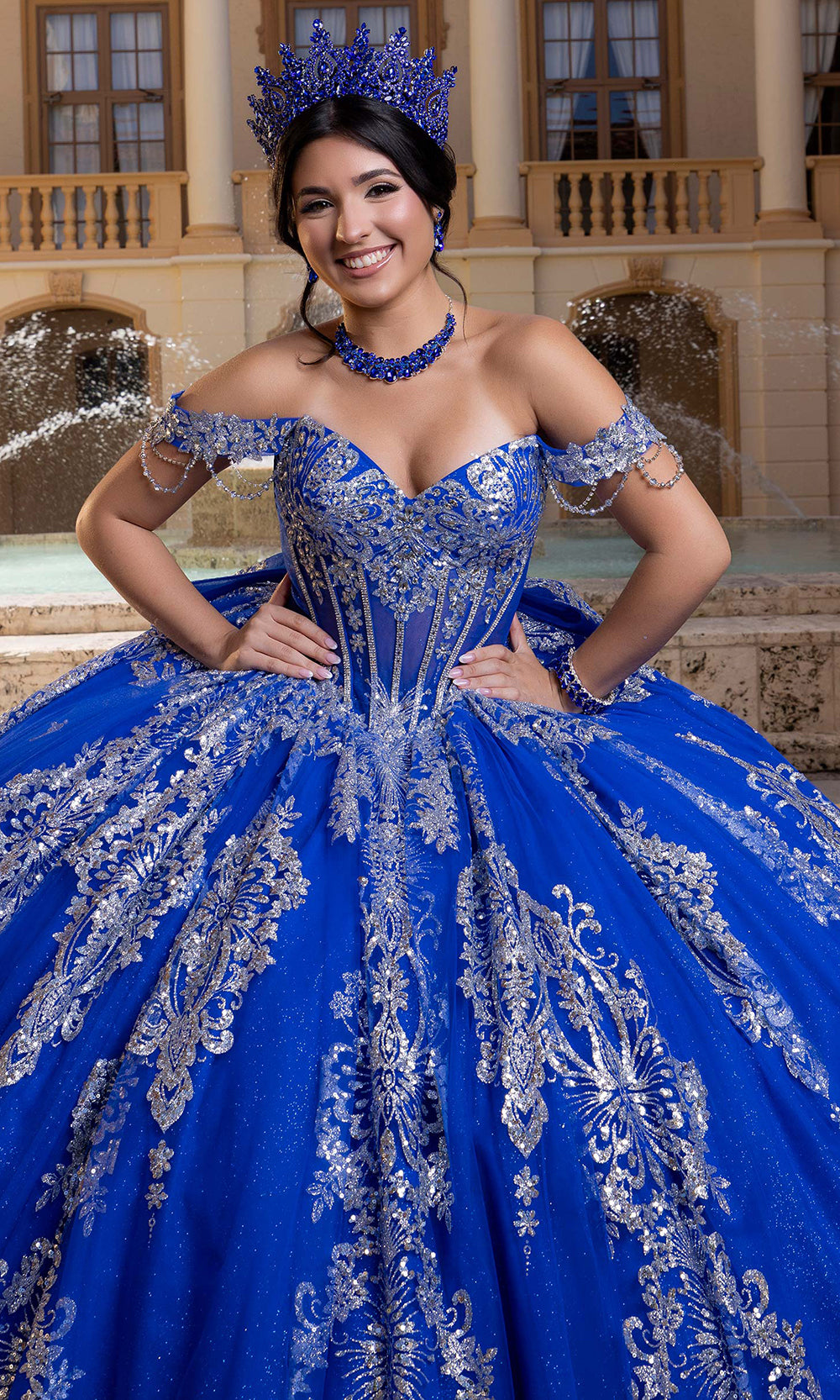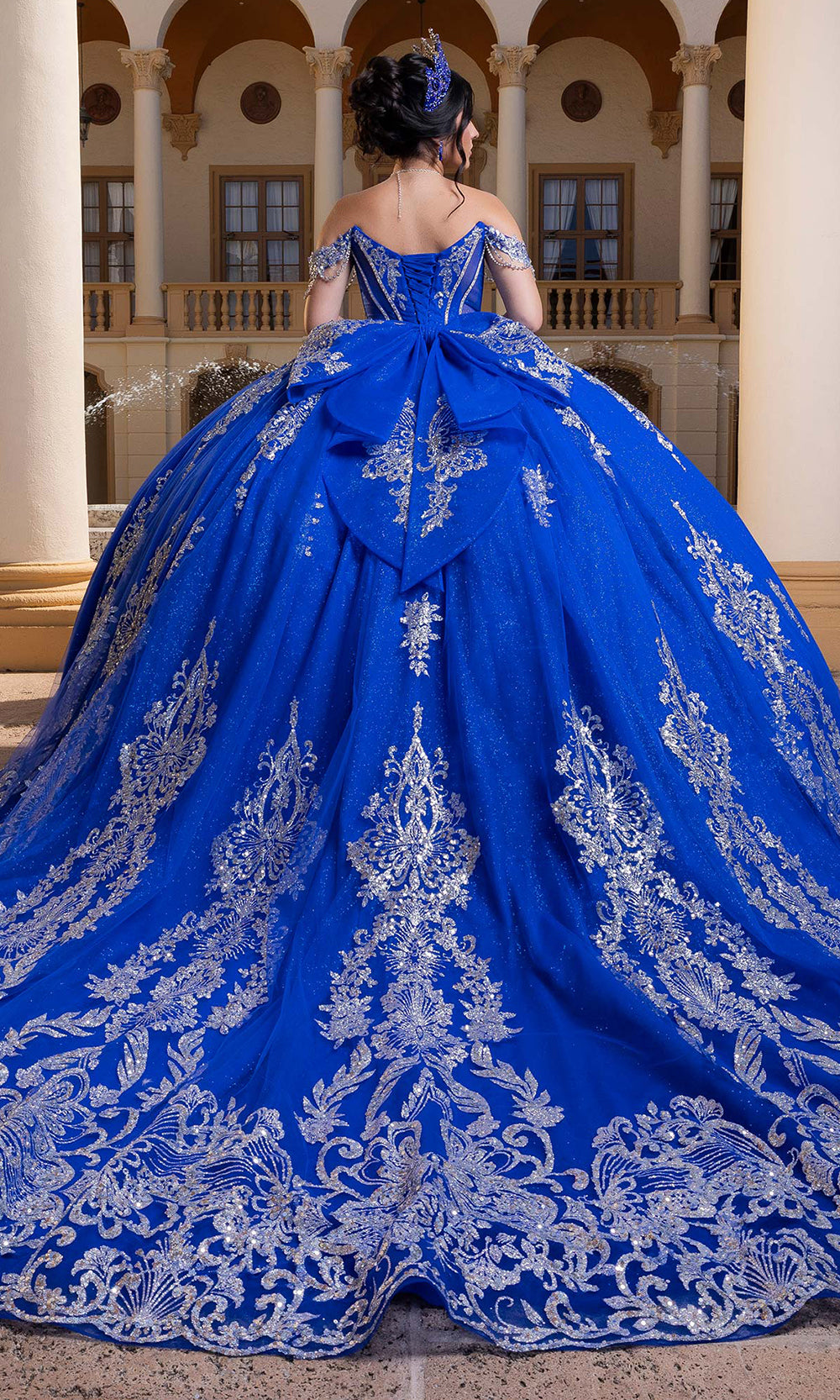 Make your celebration unforgettable with the dazzling Vizcaya by Mori Lee 4080021 masterpiece. This quinceanera gown begins with a strapless sweetheart neckline that perfectly frames the shoulders and collarbone. The structured corset bodice glimmers with crystal and sequin embroidery, sculpting a flawless fit that transitions into a dramatic full ballgown skirt. Enhanced with metallic accents, the gown moves with luminous grace and grandeur. Includes off-shoulder sleeves designed to detach, paired with a removable bow detail at the back. A striking piece for your special day, this Vizcaya by Mori Lee 4080021 design merges sophistication and timeless beauty. Model is wearing Regal Royal/Silver color.