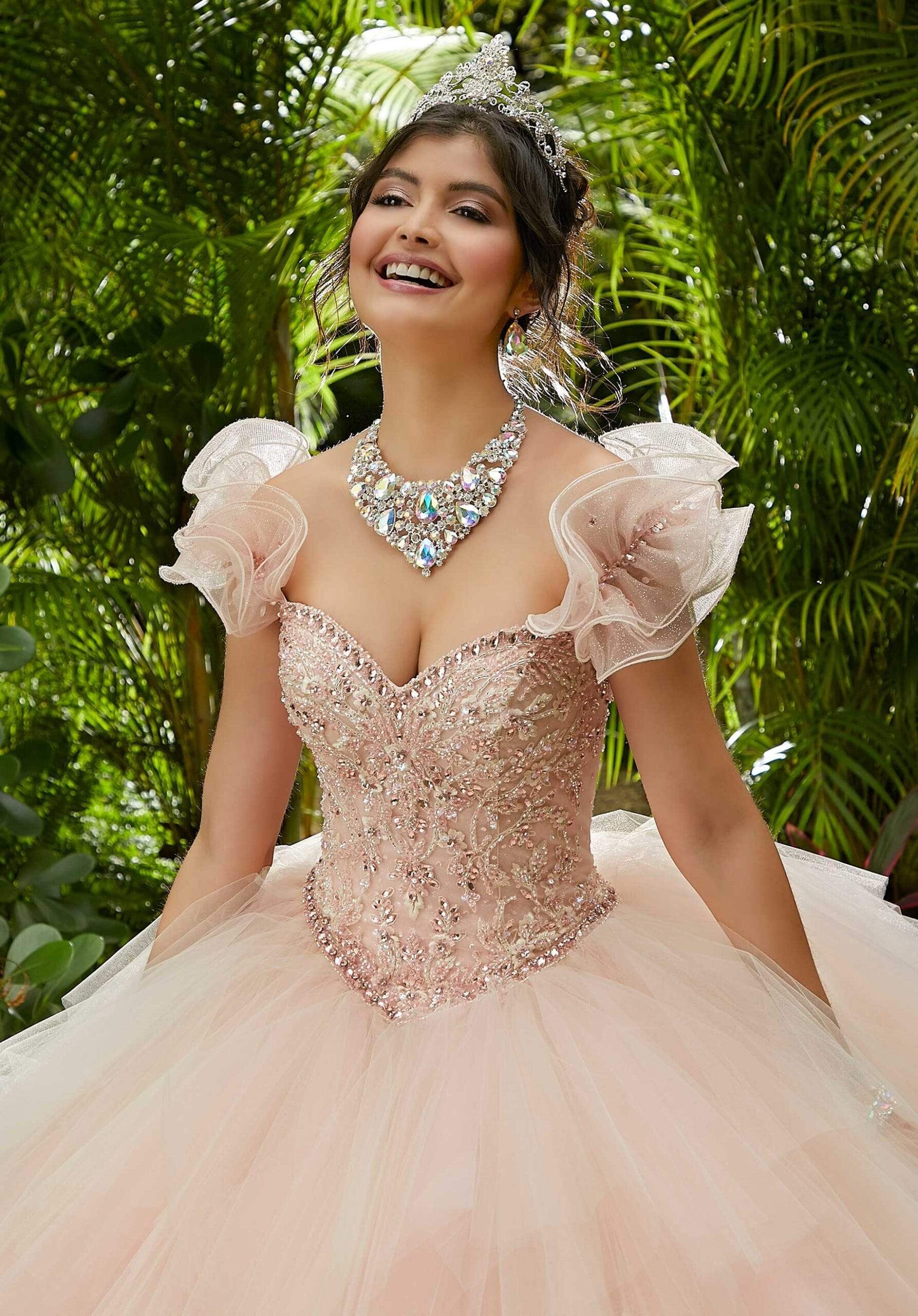 Strut your stuff in this head-turning look by Vizcaya by Mori Lee 89283. This sparkle tulle gown charms in a sweetheart neckline with bodice lavishly ornate with embroidery and crystal beading. It has a lace up back for an adjustable fit and is designed with detachable ruffle sleeves. From the basque waist flourishes a ballgown skirt. Sizzle all night in this fabulous look by Vizcaya by Mori Lee.