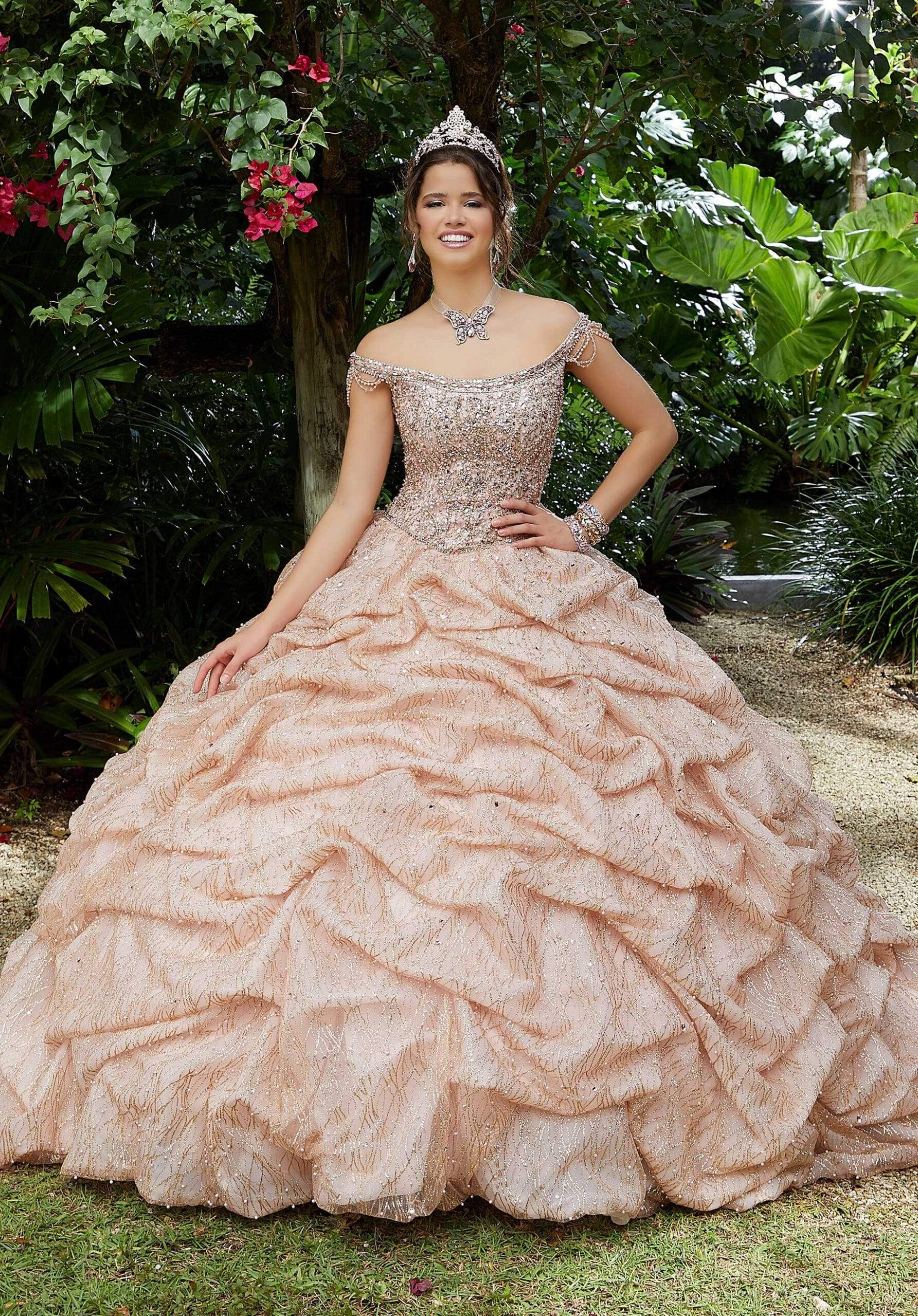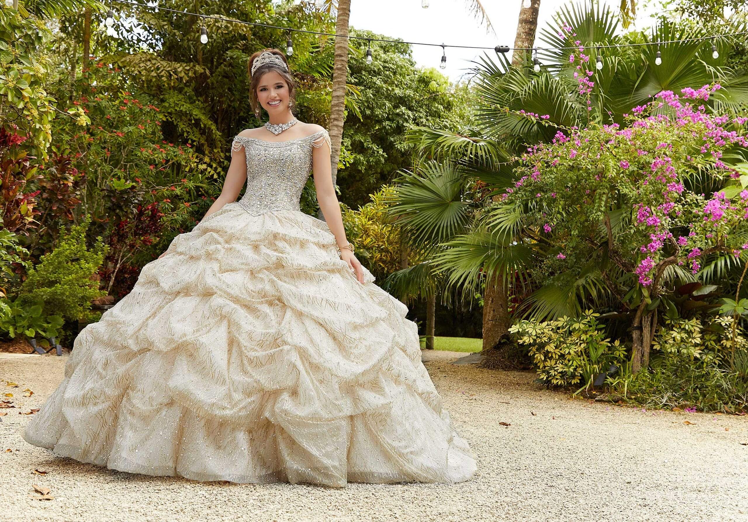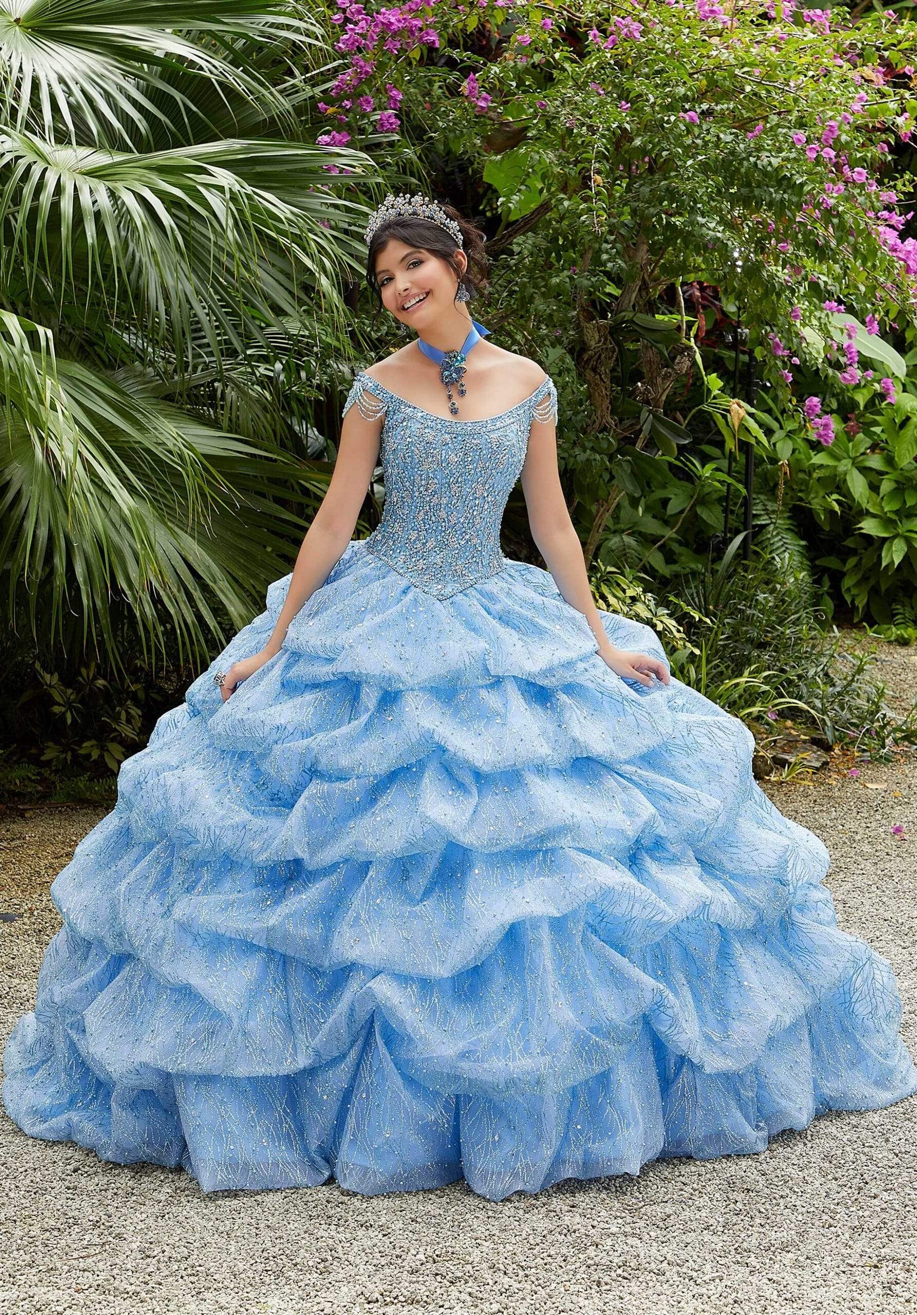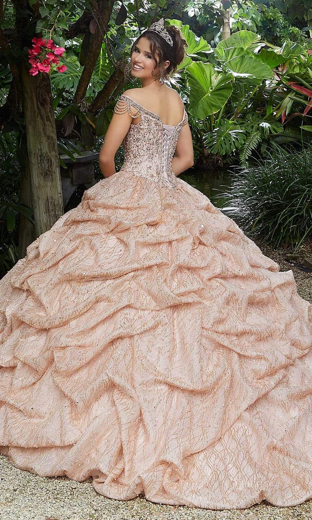 Make your entrance grand and dramatic in this Vizcaya by Mori Lee 89296 creation. Elaborately flaunting a spectacle of beads, crystals and pearls accenting the bodice, this gown reveals an off shoulder neckline with swathes of chandelier sleeve details. A corset detailed back perfectly rhymes with its shimmering basque waist. Pickup details ornament the ballgown skirt as it voluminously cascade into a chapel train. Matching stole included. Be a stellar vision on that special day in this Quinceanera Vizcaya by Mori Lee 89296 masterpiece.