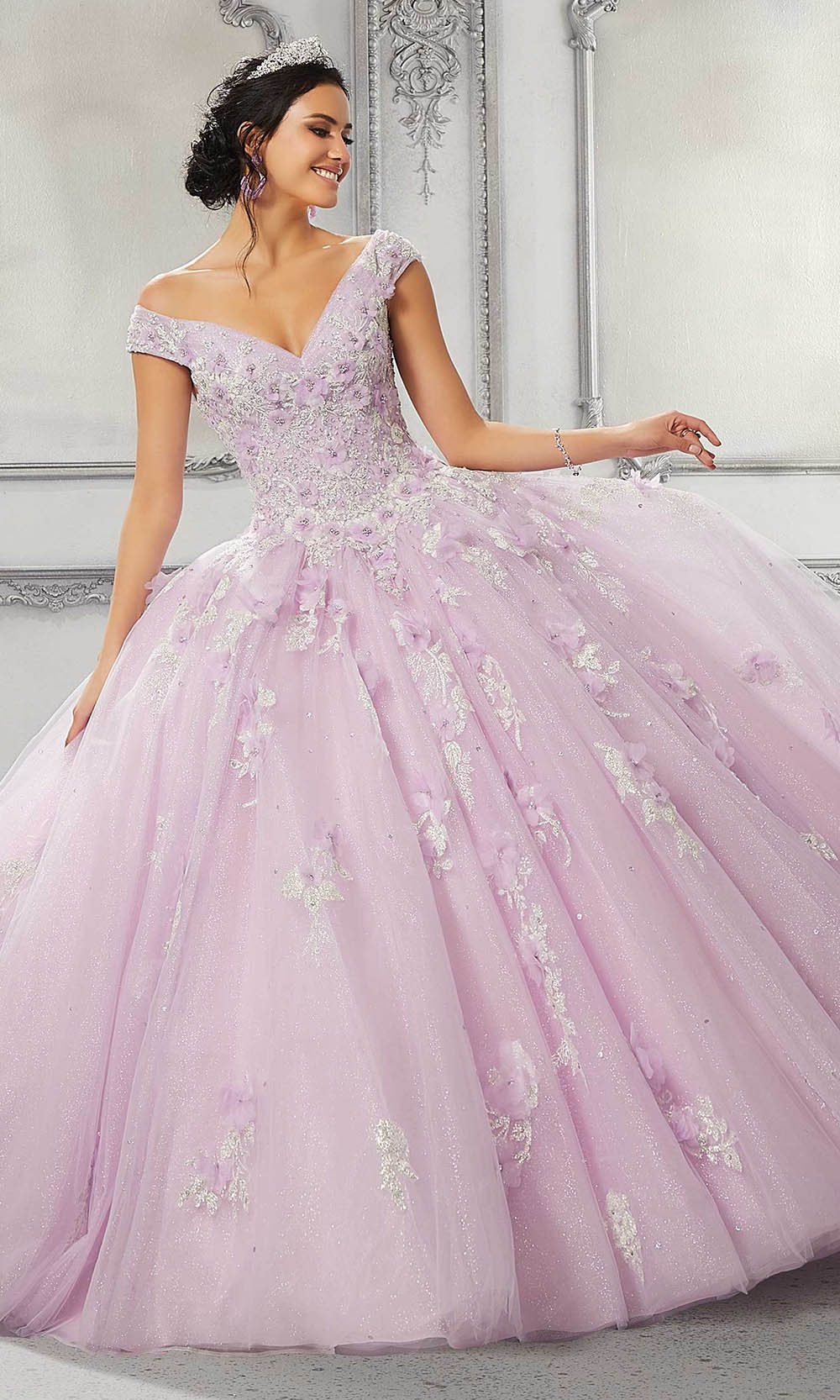 | Fabric: | Crystal beading, Floral appliques, Glitter lace, Tulle |