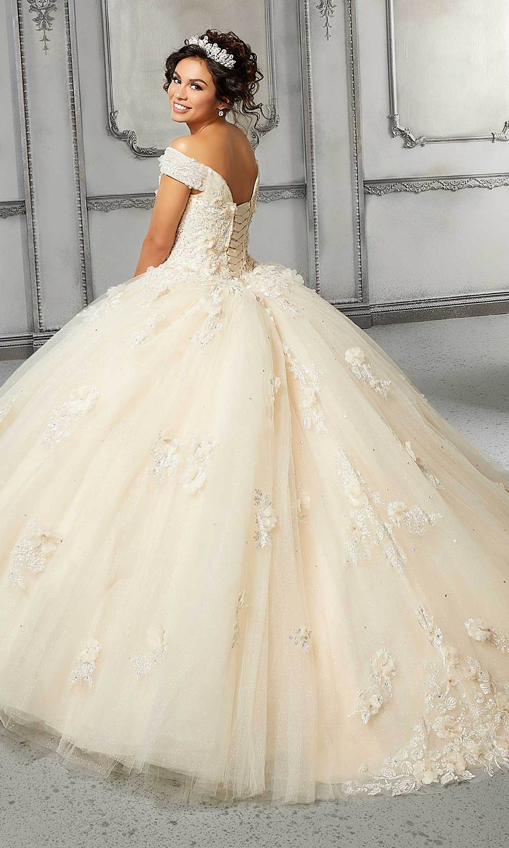Look immaculately gorgeous in Vizcaya by Mori Lee 89316. This crystal beaded gown envisions in a charming off shoulder neckline with a form-fitting bodice and a lace up back. The gown is beautifully designed with floral appliques that continue to the tulle ballgown skirt. Create magical moments as you revel in Vizcaya by Mori Lee. More colors available. Please call our sales team at 855-700-4239.