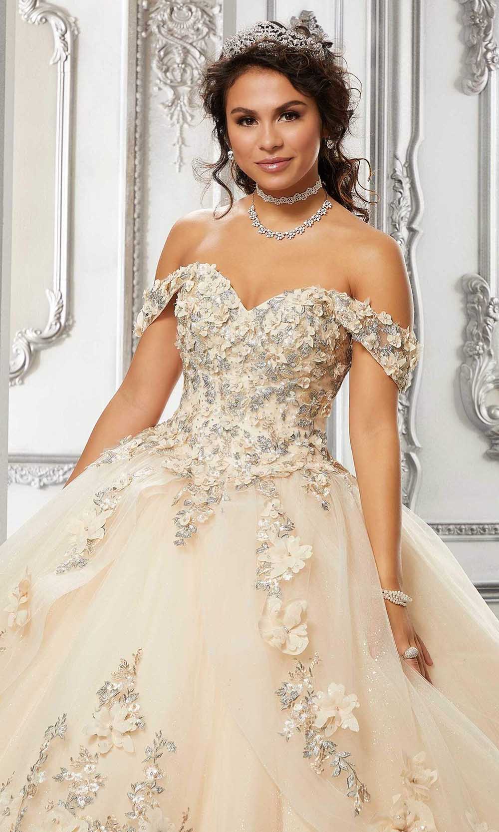 Glide into that spectacular black-tie event like an ethereal vision as you flaunt this gorgeous Mori Lee 89318. Bloom with loveliness as you wear this quinceanera dress that features a sweetheart neckline with an off-shoulder neckline. The top ha made with an floral applique fabric and the skirt is made with a floral applique tulle fabric. This dress will also make you shine as it has a touch of glitter. The back is an open back with a lace up ties that is made for security purposes that also adds to the elegance. Feel dainty and feminine in this enchantingly designed Mori Lee. More colors available. Please call our sales team at 855-700-4239.