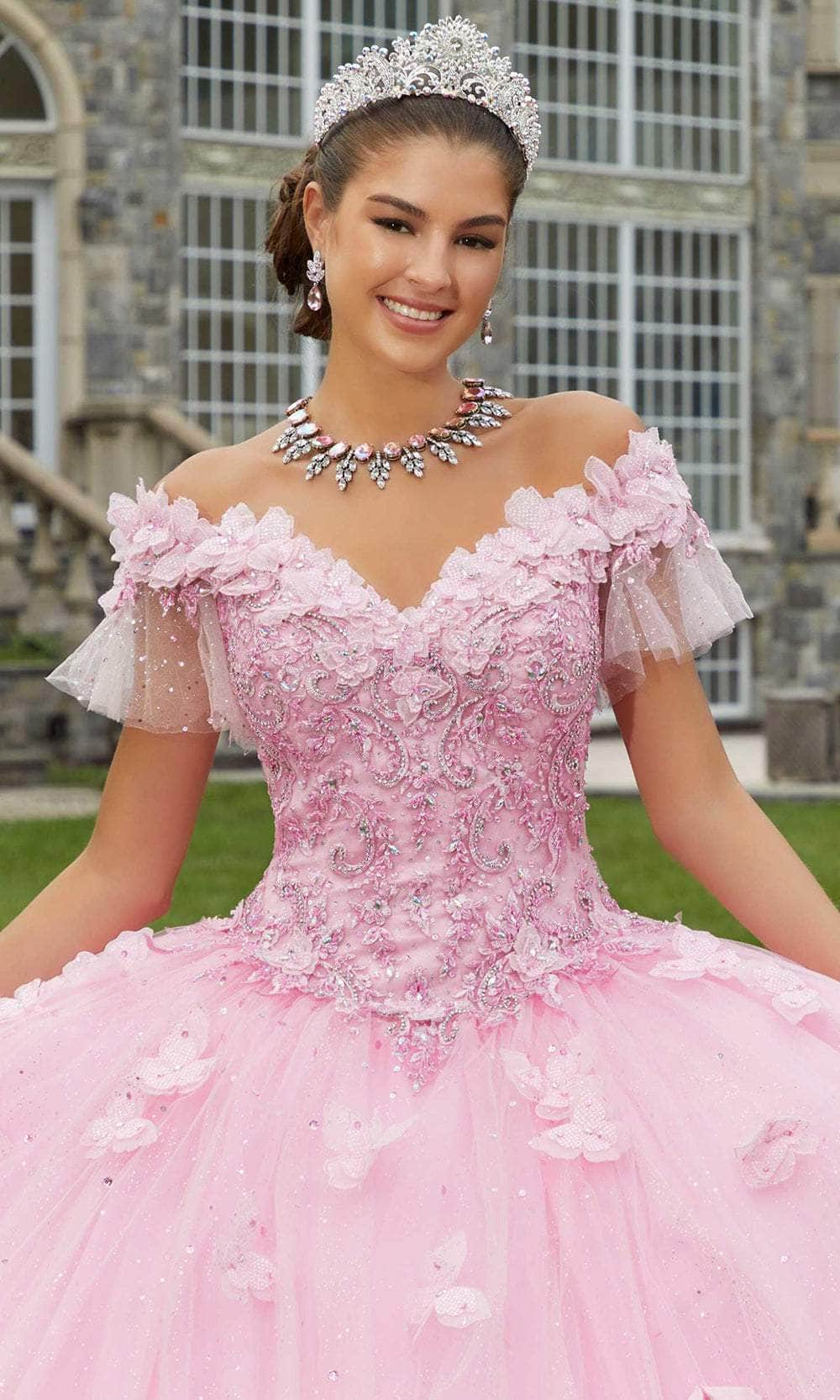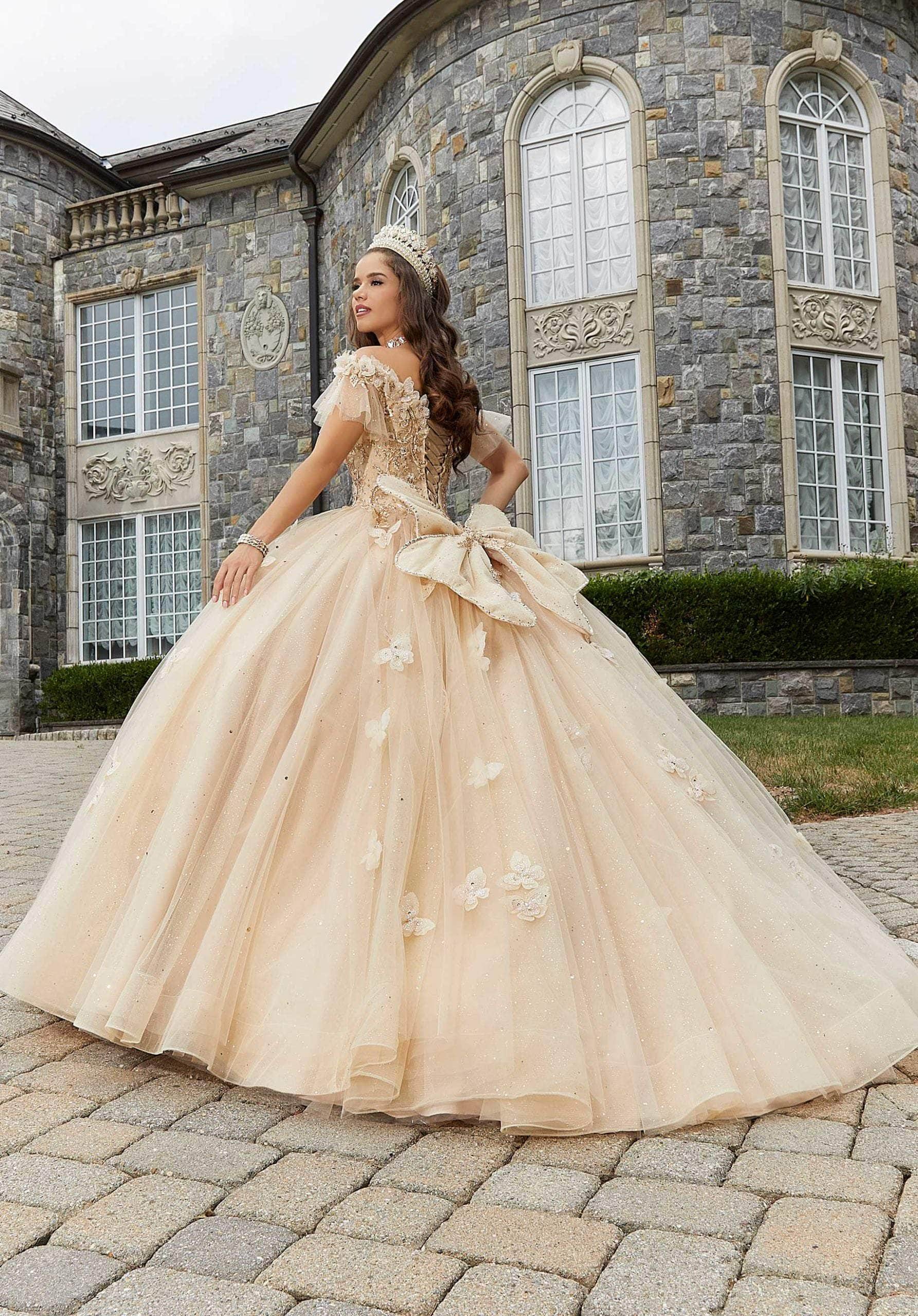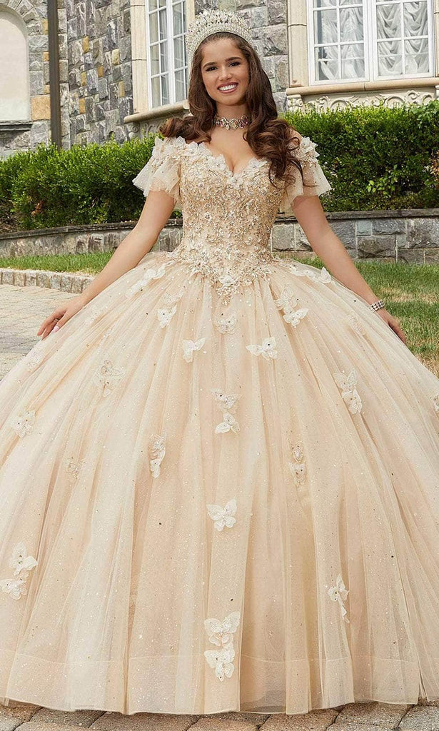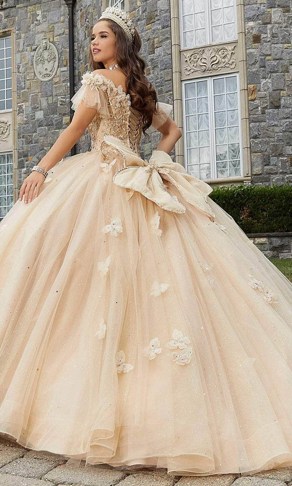 Channel your inner royalty in this Vizcaya by Mori Lee 89404 masterpiece. This gown detailed with 3D butterfly appliques, beadworks and floral embroidery create a breathtakingly beautiful aesthetic. The off-shoulder deep v-neckline and ruffled short sleeves beautifully accentuate your collarbones. Reveal your back with its mid-open design, featuring a corset lace-up tie closure to adjust the fit. A detachable back bow enhances its sweet and feminine detail. Completed in a horsehair hem and sweeping train, the skirt creates an enchanting ballgown silhouette. Capture attention as you wear this extravagant Vizcaya by Mori Lee 89404 gown. Models are wearing Nude/Gold, and Pucker Up Pink colors.