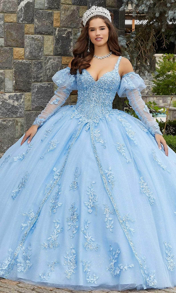 Traditional style gets a glam twist in a sophisticated dress from Mori Lee 89407. Wear this item to rule the night appearing like a real-life princess. It has a voluminous silhouette and a ball gown style. Has a V-shaped neckline and shoulder straps on a sleeveless top. The bodice was expertly embroidered with floral designs, and the embroidery was scattered throughout the skirt. It's also obvious that some glitters will make you glow. The night is yours in a spectacular gown from Mori Lee 89407. Models are wearing Bright Mint and Bahama Blue color.