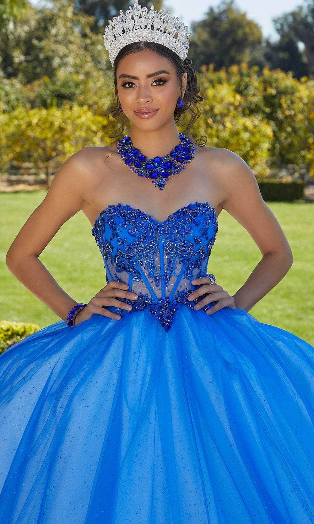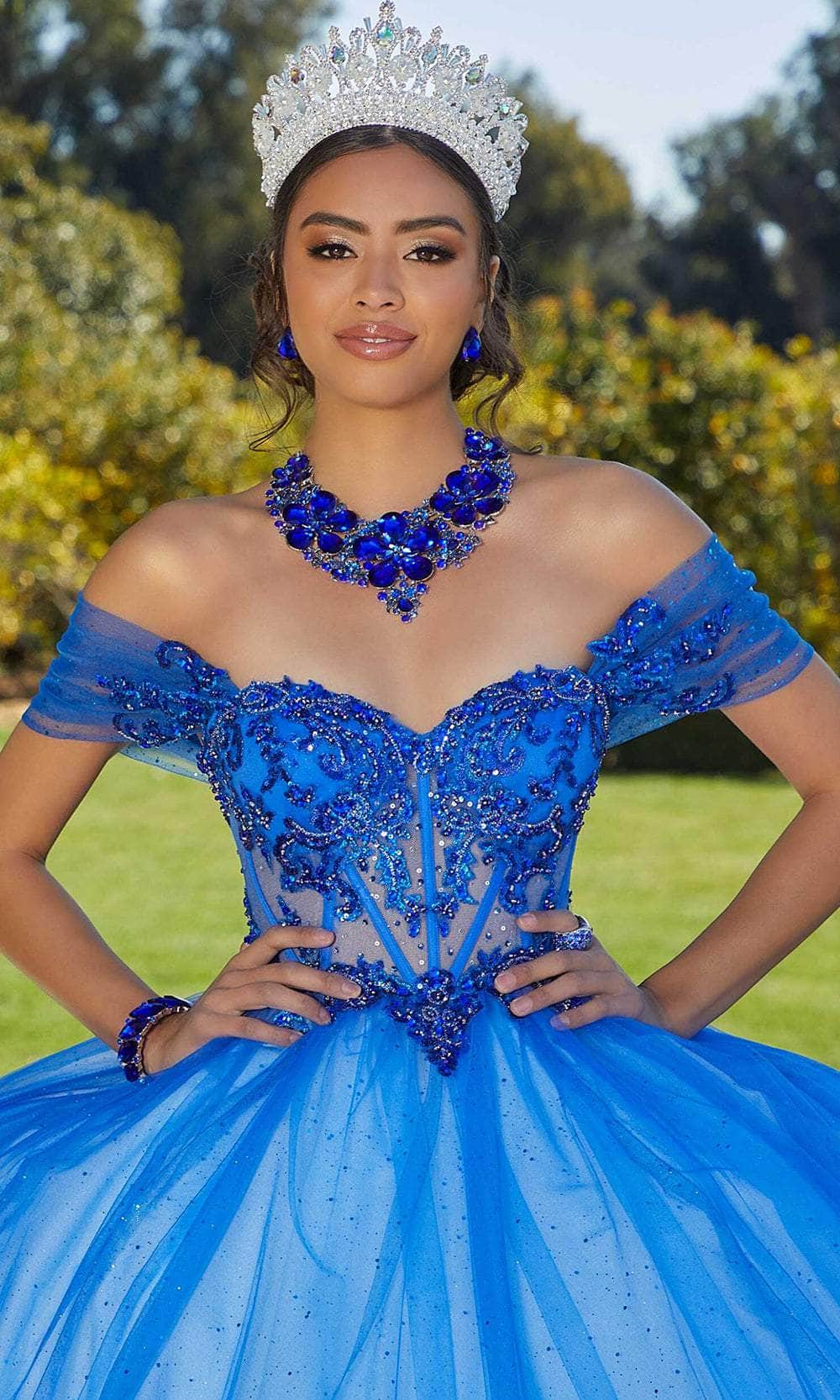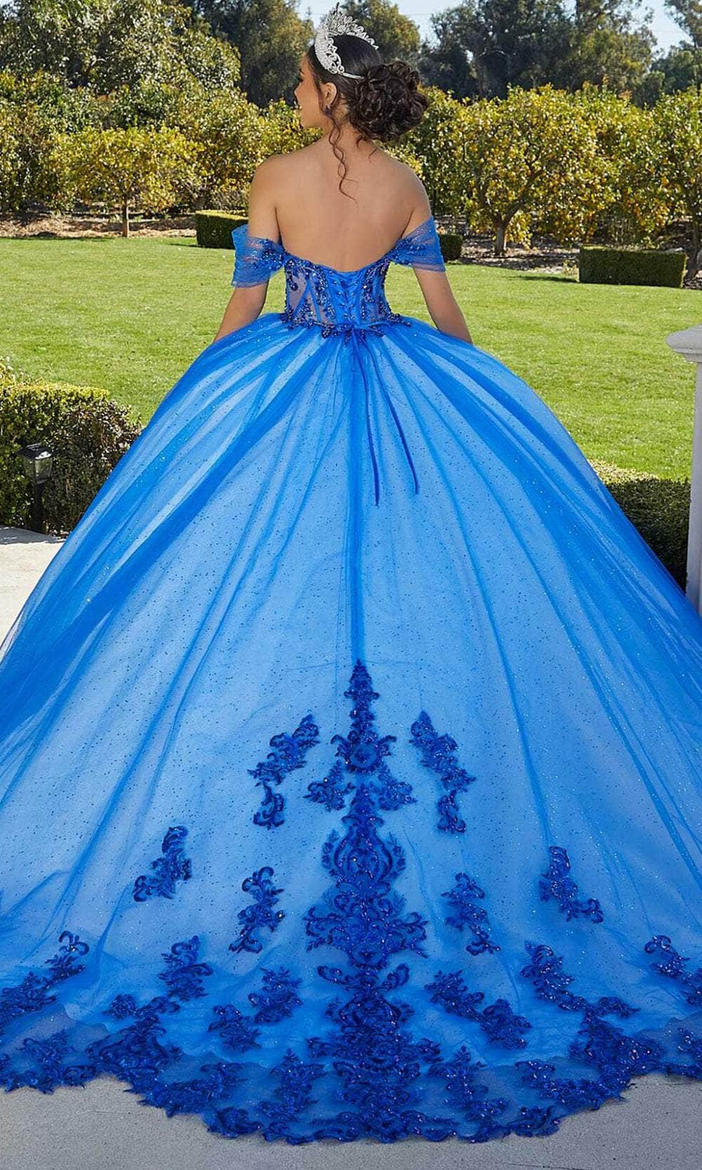 Delight onlookers and make an extraordinary impression in this Vizcaya by Mori Lee 89427 masterpiece. Perfectly fit for a modern-day princess, this strapless ensemble is made from glitter tulle fabric with crystal beads and embroidery decorations. The sweetheart neckline and open back with adjustable lace-up tie design add a touch of allure. It also highlights the illusion corset bodice with visible boning that sculpts your figure effortlessly. Gathered from the natural waist, the skirt makes a voluminous ballgown silhouette and cascades to the grandeur chapel train with a scalloped lace design. Complete with detachable off-shoulder sleeves and a matching stole. Glow beautifully when wearing this Vizcaya by Mori Lee 89427 gown. Models are wearing Blue Orchid, Royal/Light Blue, and Scarlet/Champagne colors.