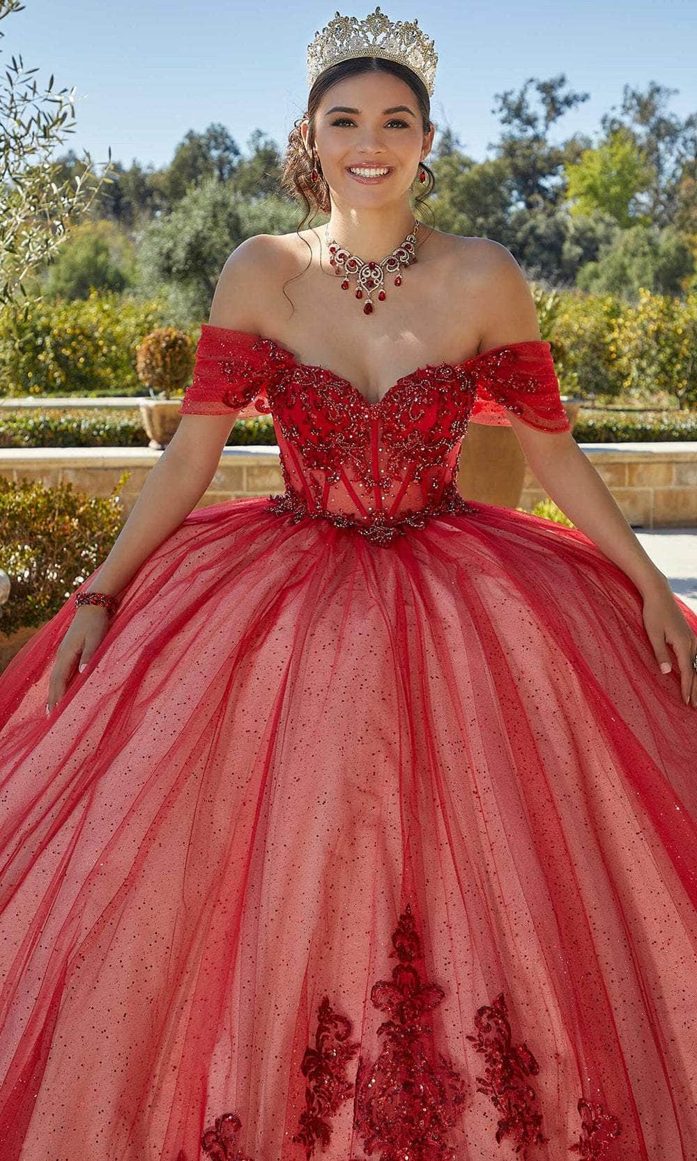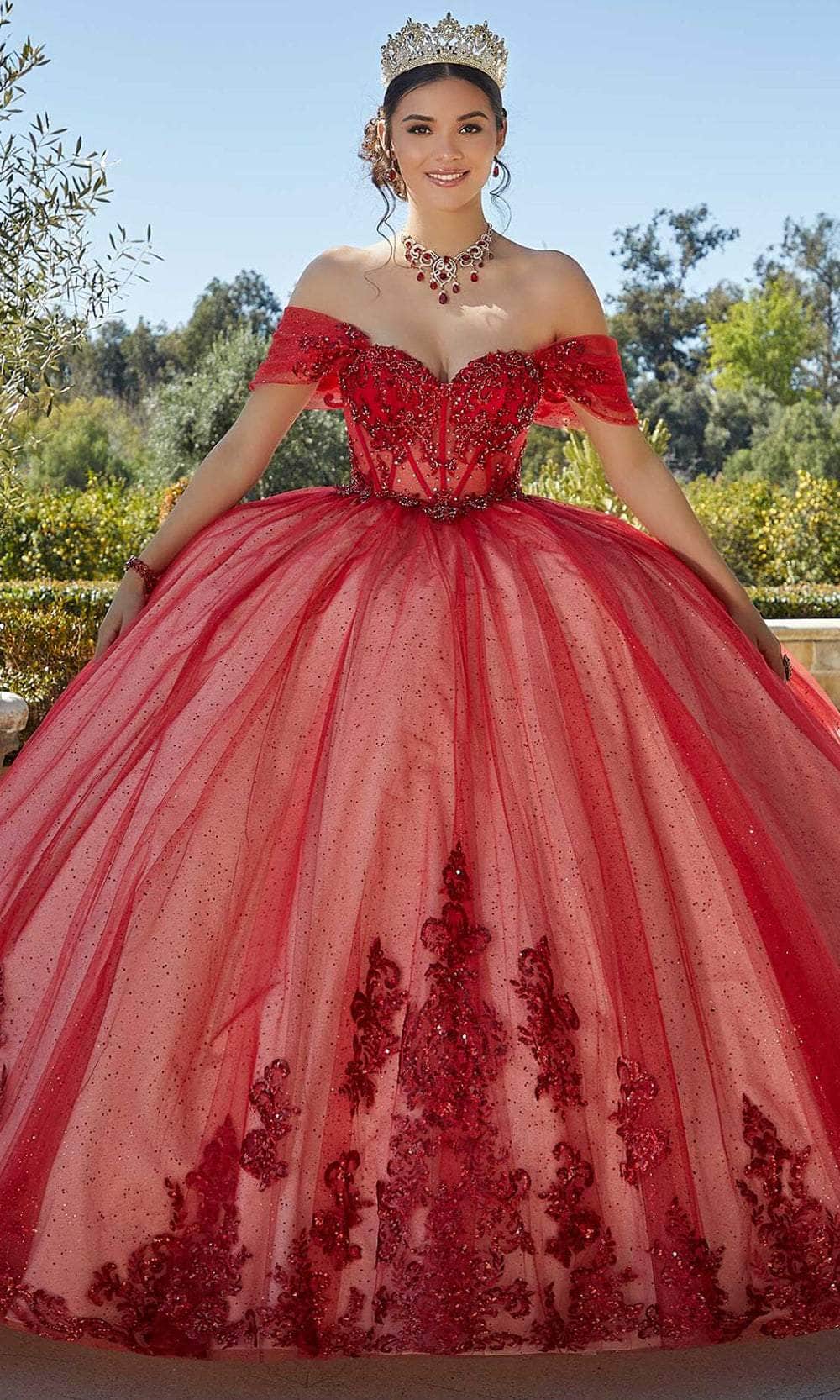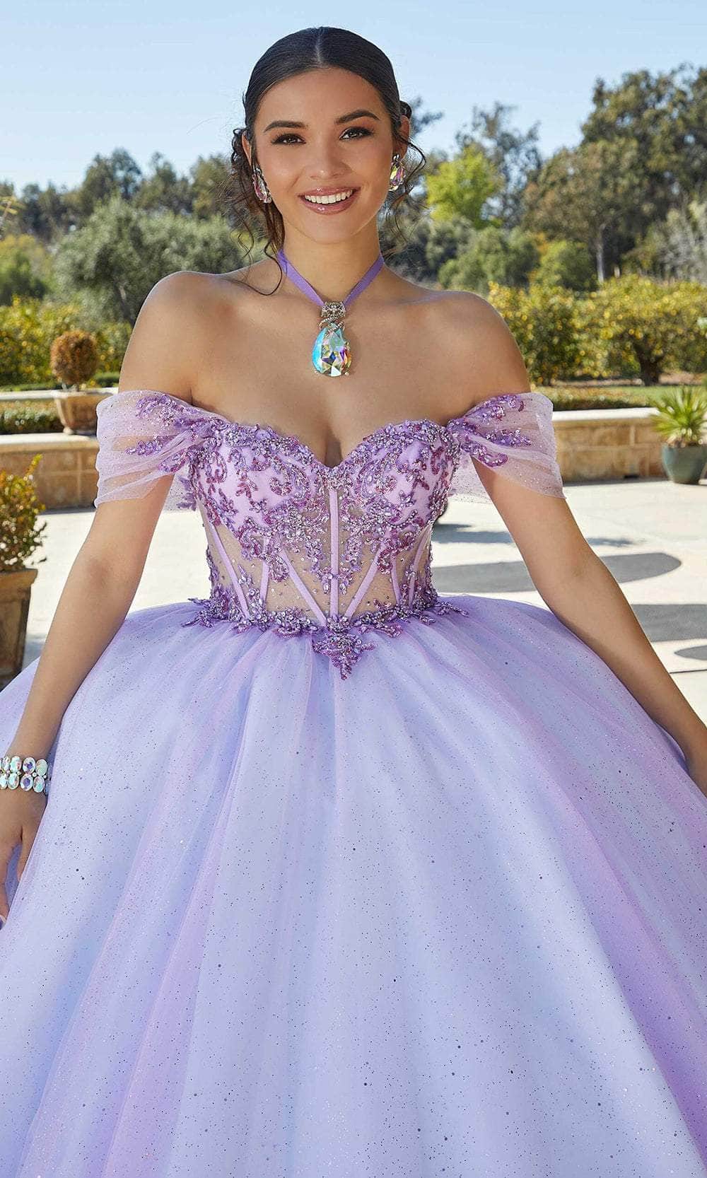 Delight onlookers and make an extraordinary impression in this Vizcaya by Mori Lee 89427 masterpiece. Perfectly fit for a modern-day princess, this strapless ensemble is made from glitter tulle fabric with crystal beads and embroidery decorations. The sweetheart neckline and open back with adjustable lace-up tie design add a touch of allure. It also highlights the illusion corset bodice with visible boning that sculpts your figure effortlessly. Gathered from the natural waist, the skirt makes a voluminous ballgown silhouette and cascades to the grandeur chapel train with a scalloped lace design. Complete with detachable off-shoulder sleeves and a matching stole. Glow beautifully when wearing this Vizcaya by Mori Lee 89427 gown. Models are wearing Blue Orchid, Royal/Light Blue, and Scarlet/Champagne colors.