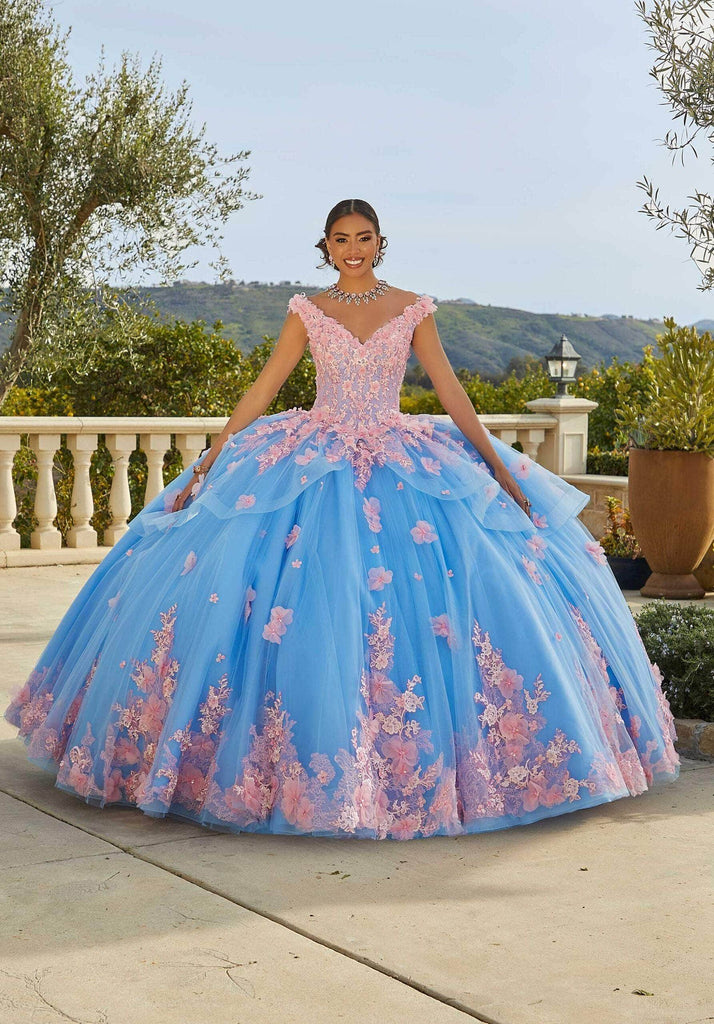 Embark on a fantastical journey with Mori Lee 89437, a ball gown that captures the essence of timeless beauty. The off-the-shoulder Chantilly lace bodice is a work of art, adorned with delicate crystal-beaded three-dimensional floral appliqués that create a captivating contrast. As if from a dream, these appliqués cascade down the tulle skirt, forming a stunning hemline border that embodies elegance. A lace-up tie ensures a perfect fit, while the gown's sweep train adds a touch of grandeur. Mori Lee 89437 makes every step a graceful dance of enchantment. Models are wearing Sage/Lilac and French Blue/Pink colors.