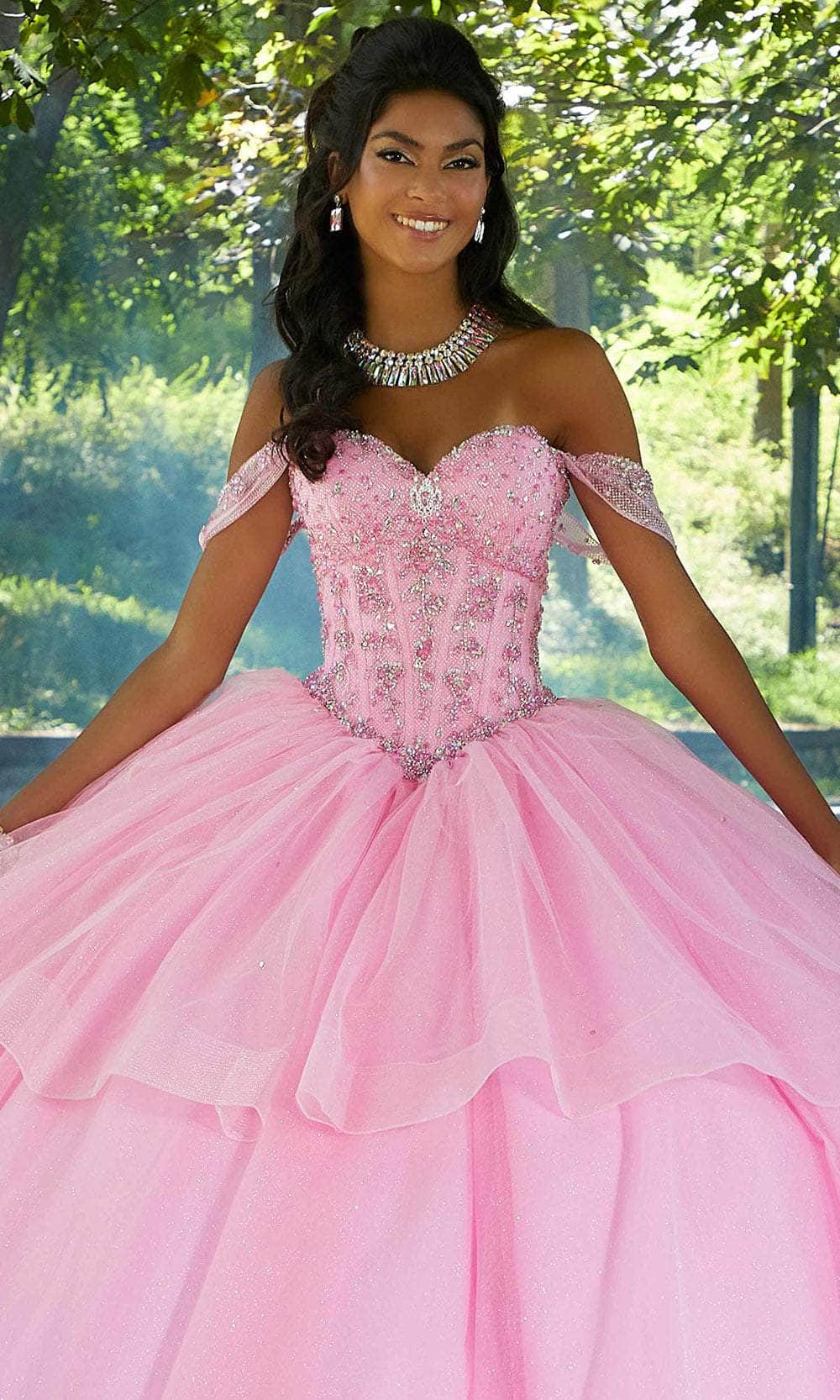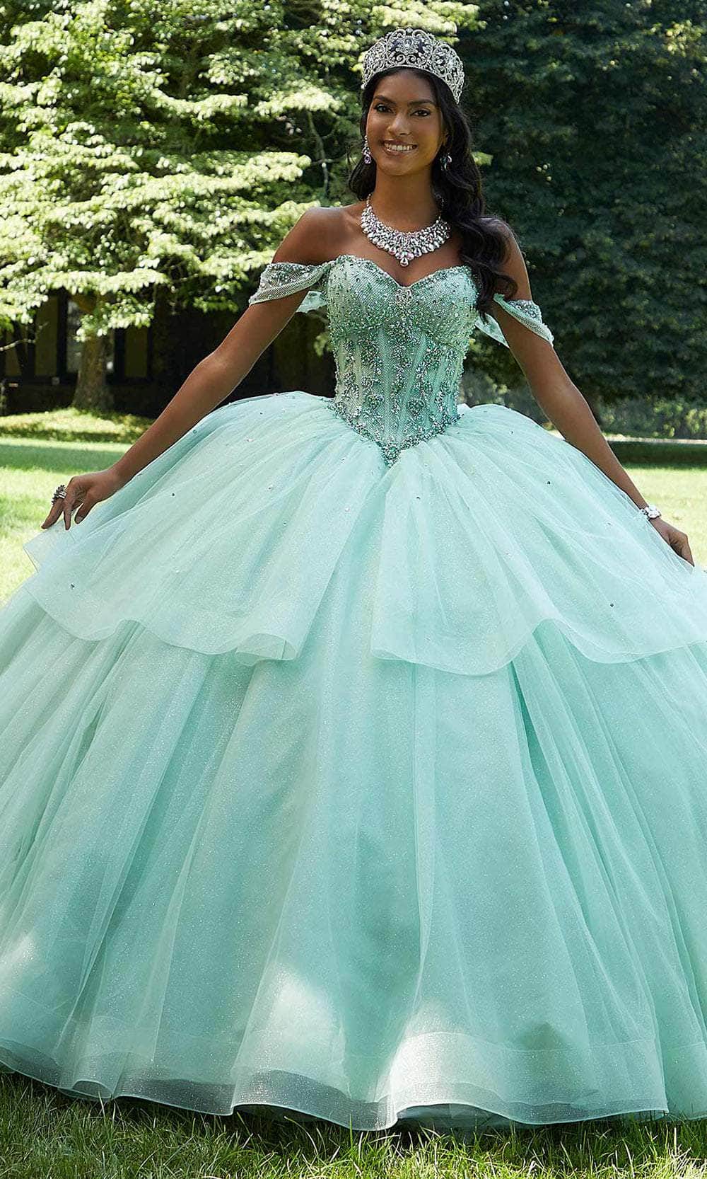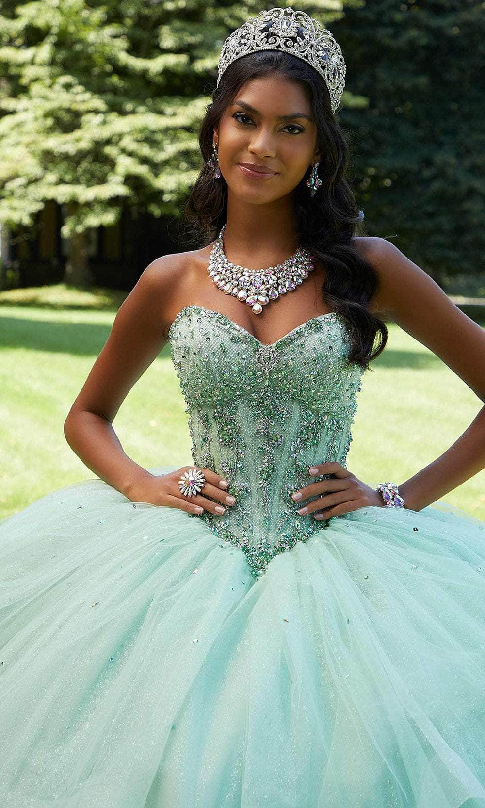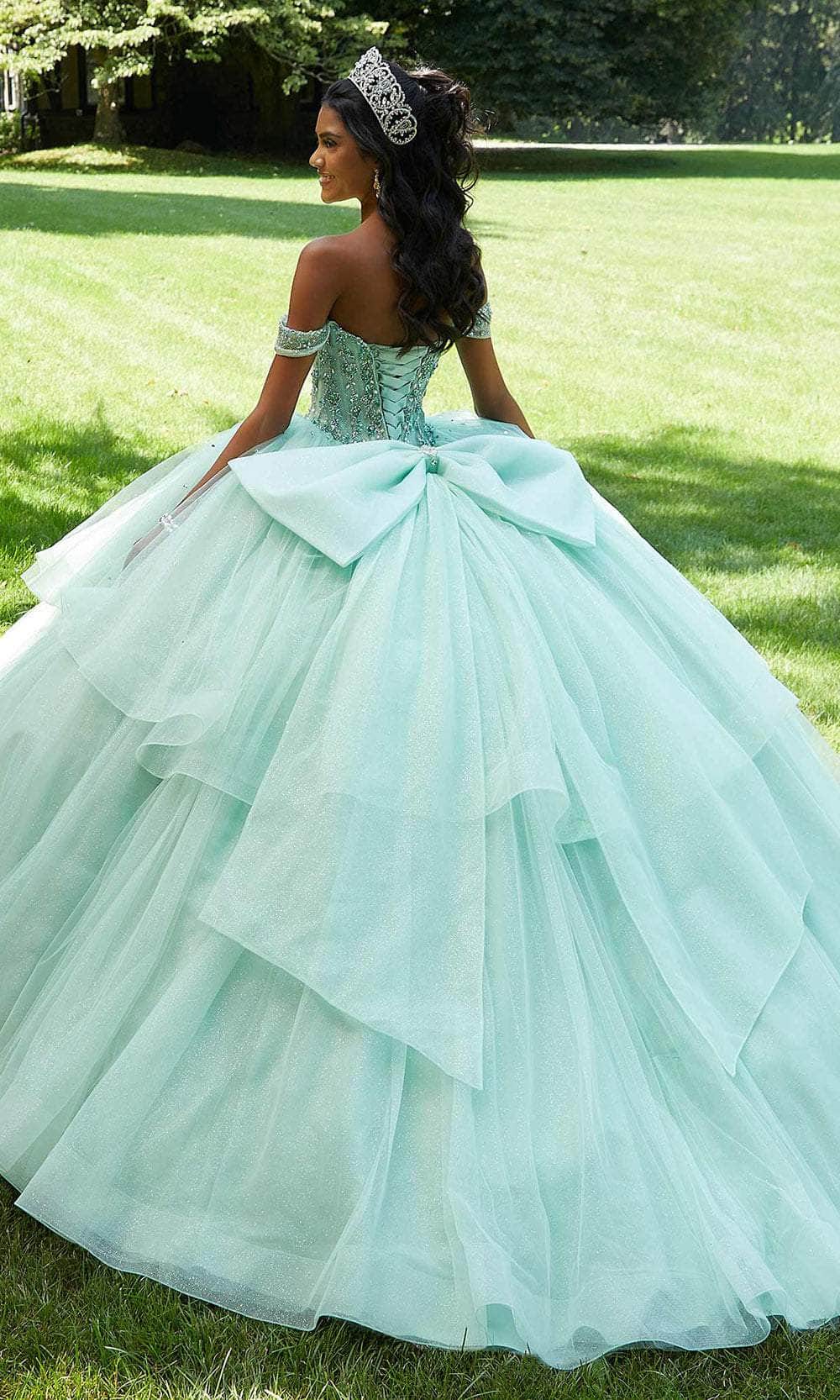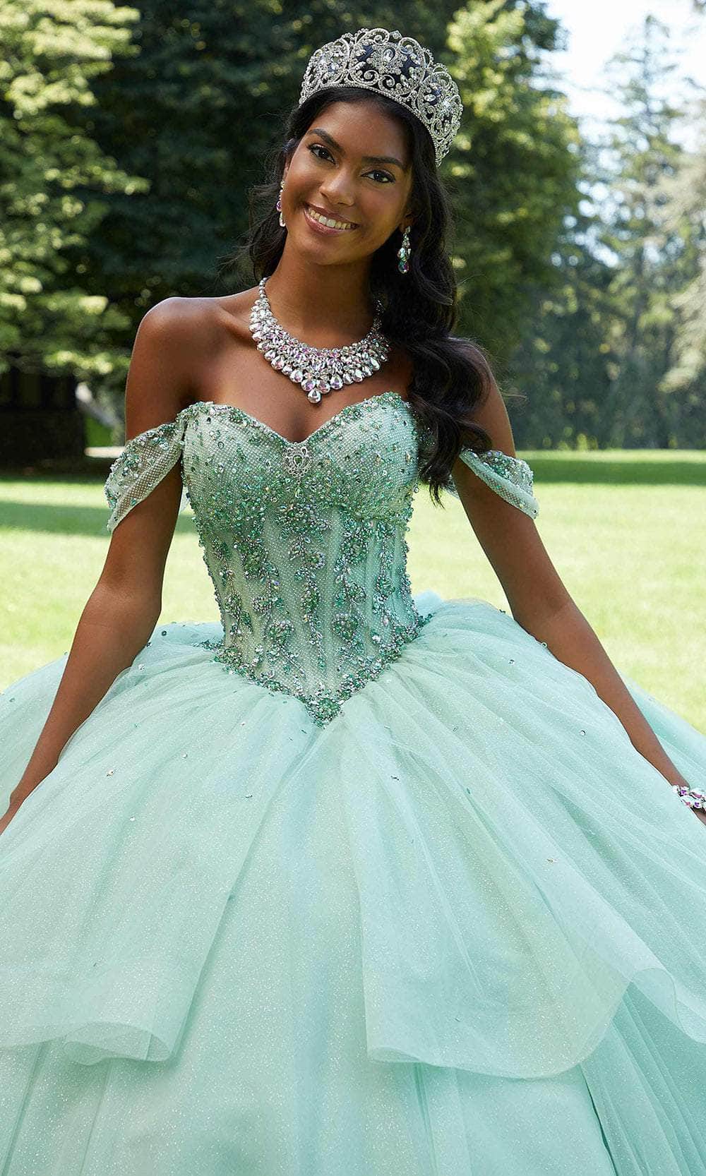 Look amazing for the party in this Mori Lee 89449 is a breathtaking gown tailored from delicate tulle fabric, intricately beaded for a touch of glamour. The dress showcases a detachable off-shoulder and corset bodice, graced with a sweetheart neckline that exudes timeless elegance. A lace-up tie and a charming bow accent at the back ensure a perfect fit. The floor-length skirt flows gracefully in a regal ballgown silhouette, concluding with a sweeping train. This Mori Lee 89449 is an exquisite choice for those seeking a captivating and enchanting presence at any special occasion. Models are wearing Bubble and Sage colors.