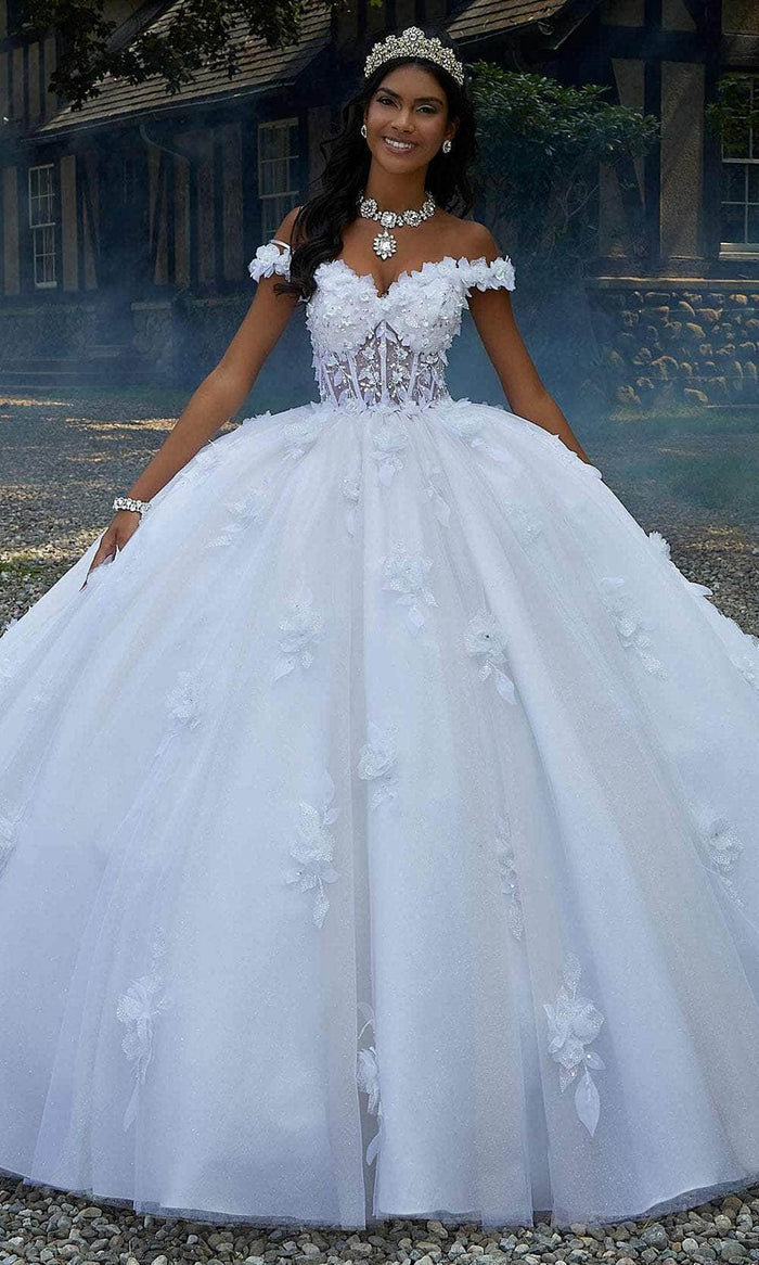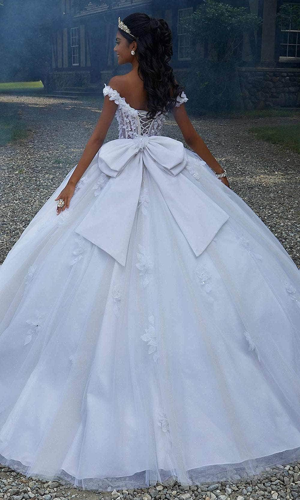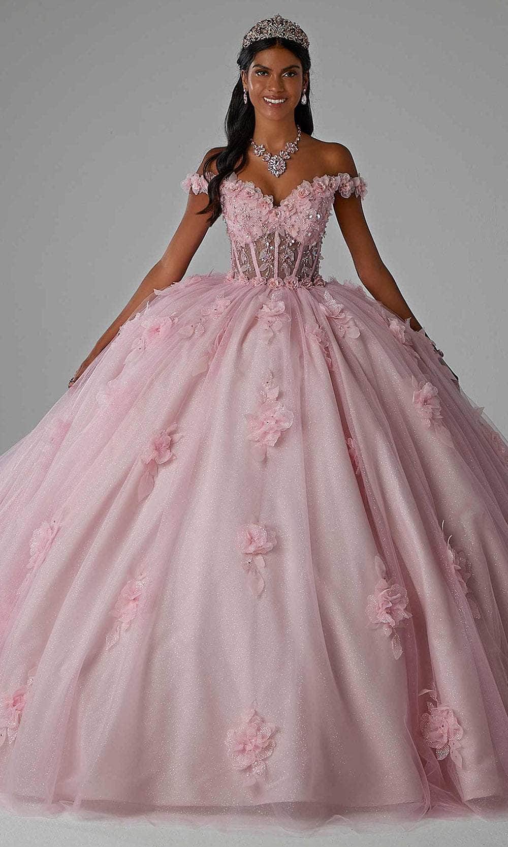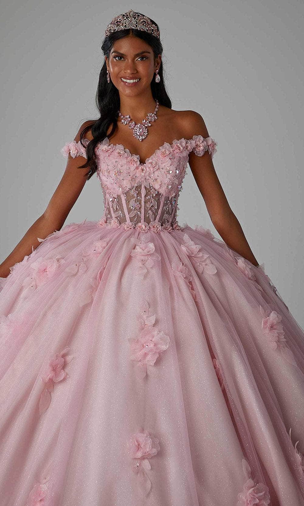 Make a statement in Mori Lee 89456, a stunning quinceañera ball gown that captures attention. The sheer bodice exposes intricate boning, showcasing the mesmerizing glimmer of the sparkle tulle fabric. Crystal-beaded, three-dimensional floral embroidery adorns the sweetheart neckline and off-the-shoulder sleeves, cascading down the full skirt. A sweet detachable back bow adds the perfect finishing touch to this enchanting ensemble. Complete the look with the included matching stole. Mori Lee 89456 promises a captivating presence for your special quinceañera celebration. Models are wearing Crema and Cotton Candy colors.