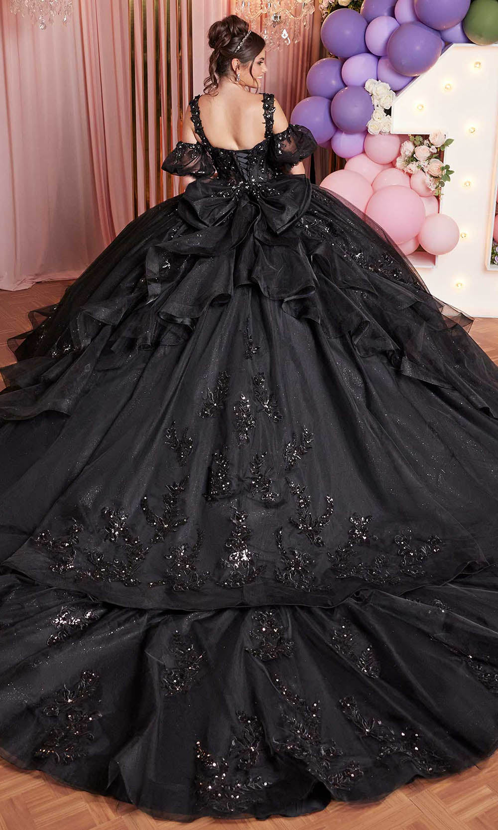 Make your quinceanera memorable with the artistry of Vizcaya by Mori Lee 89516, a gown of glitter tulle and dramatic detail. The sweetheart bodice boasts corset boning, crystal embroidery, and a striking brooch centerpiece. A flounced ballgown skirt cascades beautifully with ruffled layers and horsehair edge, creating depth and elegance. Removable elements, including straps, short puff sleeves, and an oversized back bow, let you customize your look. With a flowing chapel train and coordinating stole, Vizcaya by Mori Lee 89516 is the perfect choice for those who want a balance of romance, sparkle, and grandeur. Models are wearing Scarlet, and Black colors.