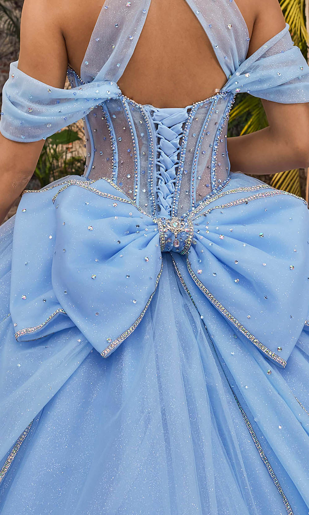 A luminous statement piece, Vizcaya by Mori Lee 89554 combines modern elegance with timeless detail. Its sweetheart bodice with crystal boning creates structured shape, while the illusion midriff lends dimension and allure. A peplum overlay flows gracefully into layers of glitter tulle, adding movement and sparkle at every step. Options for a halter neckline, off shoulder sleeves and double loop bow allow personalized styling, and a corset lace-up back ensures classic tradition. The Vizcaya by Mori Lee 89554 is the perfect ballgown to highlight your celebration. Models are wearing Butter Yellow, and Bahama Blue colors.